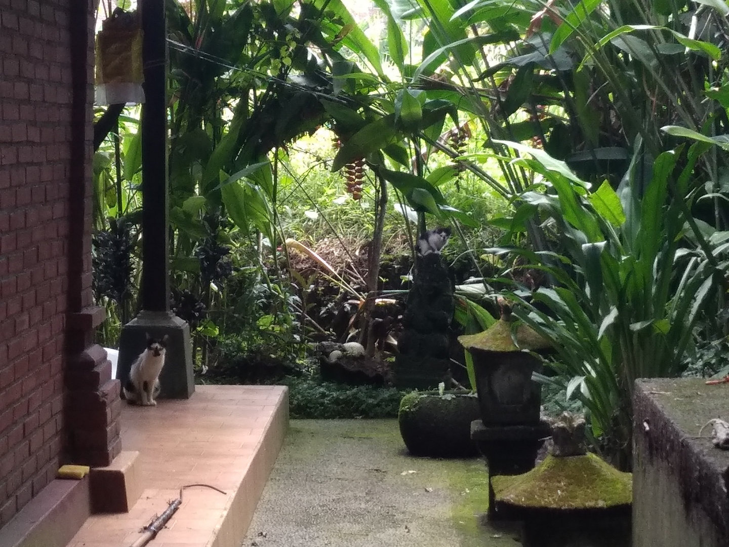 Иногда хожу пешком до магазина. Туристов нет и такое ощущение, что я брожу по территории Заброшенного отеля. Кругом пустые дома и тишина. Только разбегаются из под ног в кусты и траву желтопузые ящерицы, которые вылезли погреться под ярким солнцем на тропинку. А в пустых дворах хозяйничают кошки.