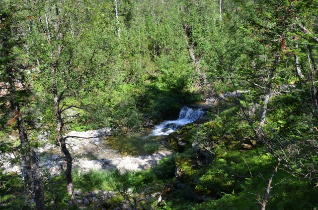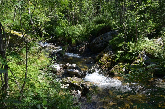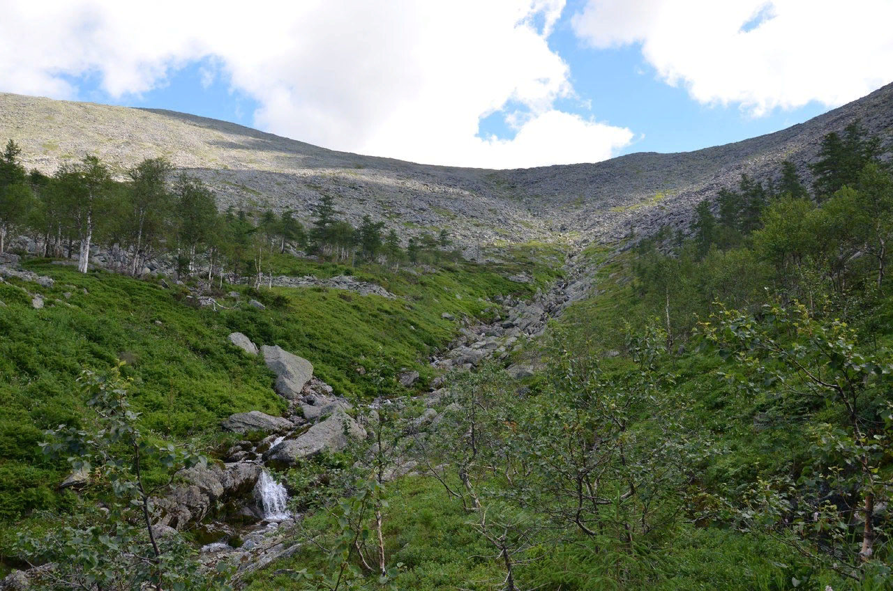 Ну вот и прошли пол пути, на одном из горных ручьёв оборудована стоянка, приваливаем. Пополняем запасы воды, дальше ручейков не будет. Решаем перекусить орехами и конфетами и тут в метрах в двух у сваленного дерева появляется молодая норка, запах орехов, шум шелеста конфетных фантиков и юная любопытность не дают ей покоя. Показав нам всю свою красоту, она прячется в ожидании нашего ухода.