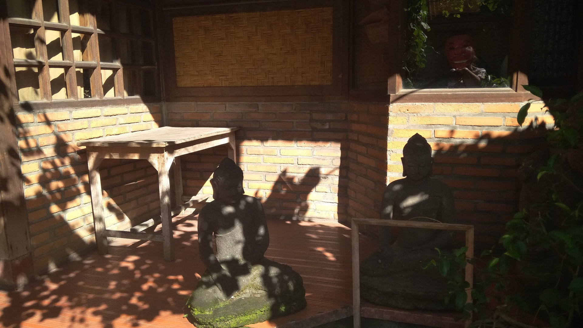 У закрытого магазина Будды неспешно беседуют, прячась от солнца в ажурной тени.