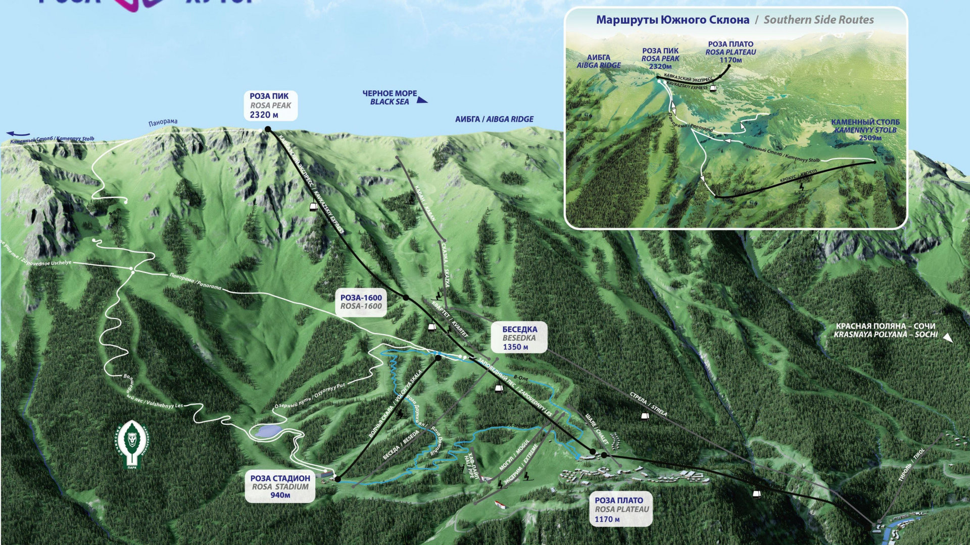 Например после Розы Пик, а это самая высокая точка канатки с Розы Хутор вы можете перейти на другую линию канатки — Эдельвейс, которая ведет в парк водопадов Менделиха, о котором будет в отдельном рассказе.