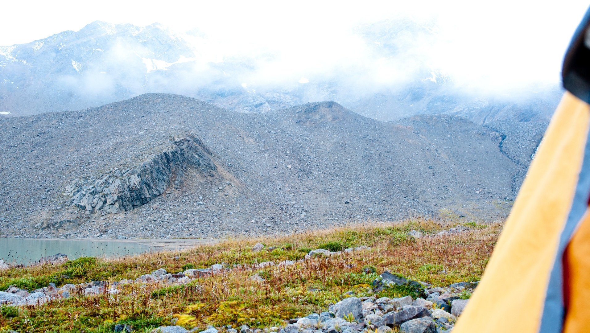 По пути наверх разглядела вторую палатку — того самого вчерашнего гостя, он уже сворачивался потихоньку. Ну а наверху их вообще оказалось человек сорок — военных, которые идут какой-то маршрут уже несколько дней, и вчера должны были ночевать на озере, но не успели дойти. А командир их успел, его-то я и видела.
