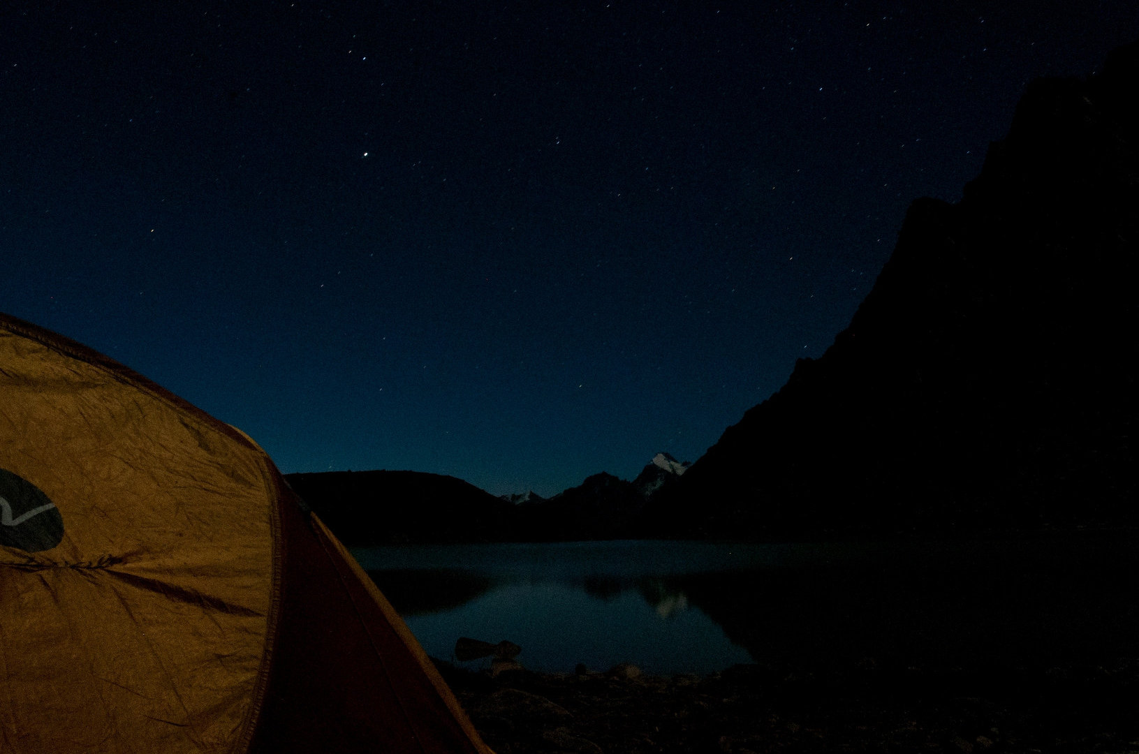 Перед сном, когда еще только начало темнеть, решила вылезти на улицу, размять ноги и немного поснимать. Вылазию, значит, смотрю — на пригорочке стоит мужик, озером любуется. Вот блин, думаю, откуда он тут взялся? Никого же не было. Это во сколько надо было выйти, чтобы к ночи прийти? Ладно, деваться некуда, залезла назад в палатку и решила до утра не высовываться. Правда ночью не утерпела, такое небо звездное было! И когда я уже начну носить с собой штатив?