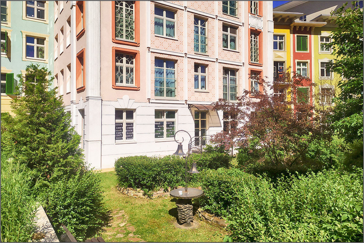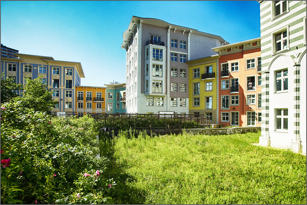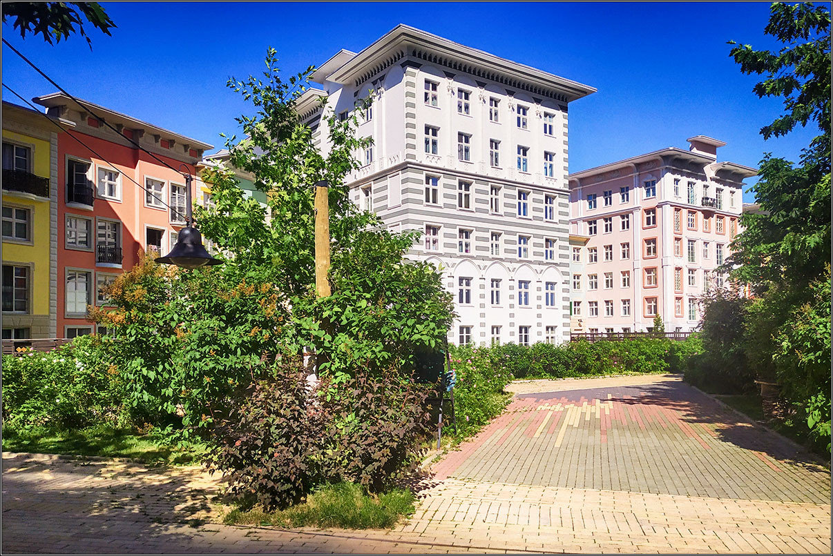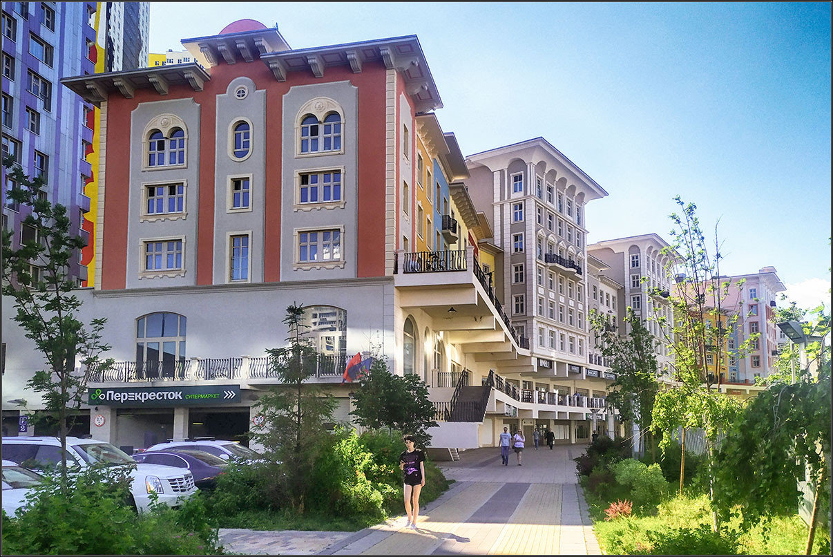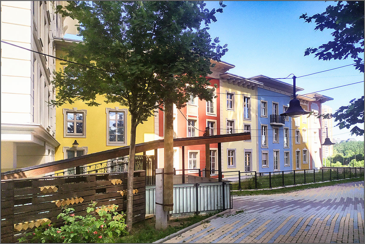 Сами дома построены так, что напоминают европейский городок: разноэтажные, выкрашенные в разные цвета, и с орнаментами на стенах. Если не оборачиваться назад, к жилым небоскребам, полное ощущение, что ты прогуливаешься где-то по итальянским улочкам. Отличная локация для фотосессий. Конечно, от центра далековато, но оно того стоит :)
