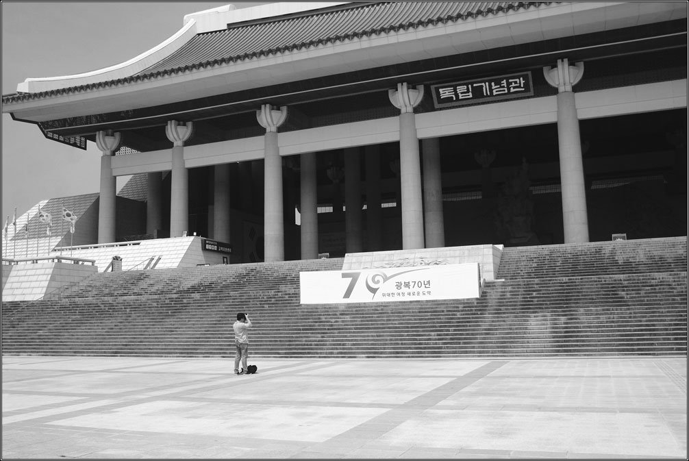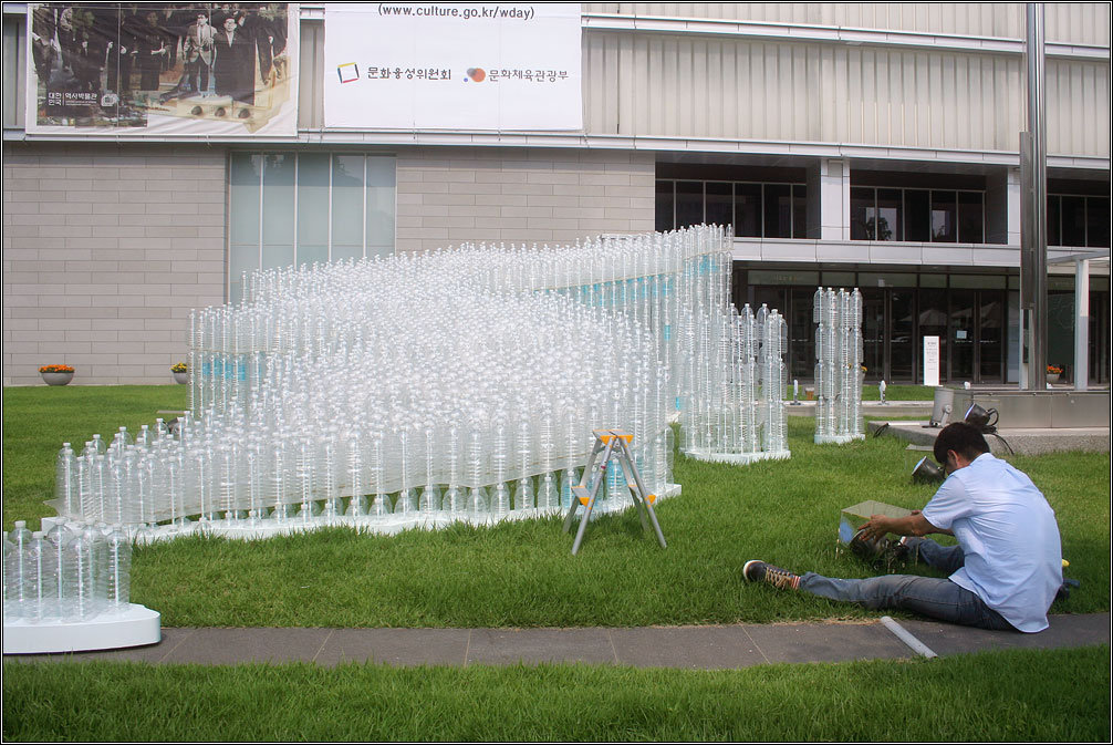 Перед музеем истории Кореи сидит мужичок, строит вот такое из пустых бутылок. То ли фонтан, то ли люстра — непонятно, но впечатляет.