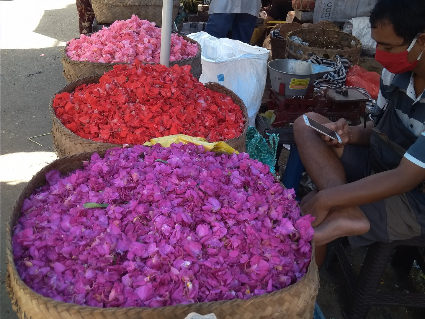 Заехала на рынок. Полно народу. Лепестки цветов продают на вес. Они нужны для чанангов-подношений духам.