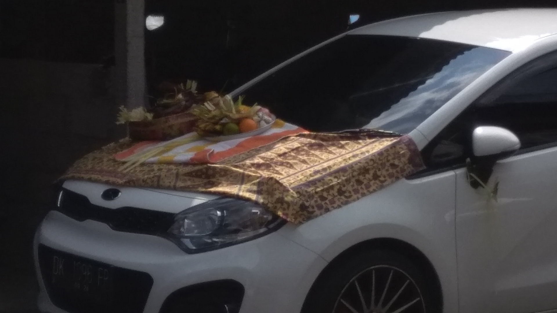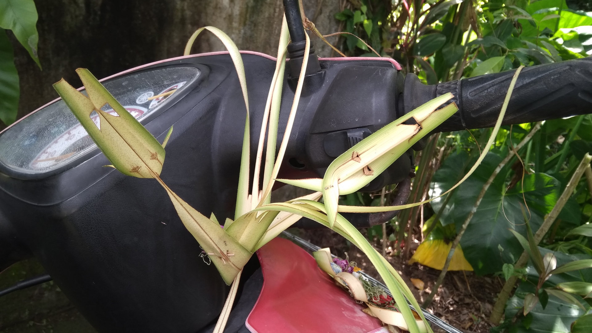Сегодня утром была церемония байков. Ну, не только байков, а всех железных механизмов. Байки и машины украшают, потом брызгают на них священной водой и читают определённые молитвы. Балийцы верят, что в каждой вещи, а тем более механизме живёт Дух. И в день церемонии балийцы просят духов беречь байки и машины от аварий и поломок. Сегодня в нашем дворе я видела и детские велосипеды, стоящие вместе с байками взрослых. Некоторые приносят на церемонию свои телефоны. Знаю случай, когда сломанный смартфон после церемонии вдруг ожил и начал работать, как ни в чём не бывало. Ну, это же Бали, чему удивляться?:)