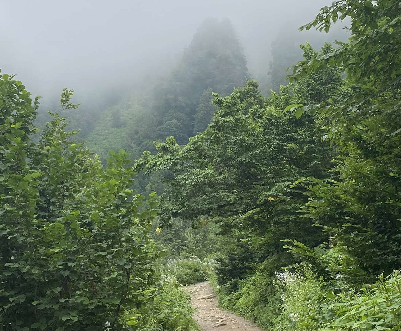 Дорога вилась по склону горы. С одной стороны открывался вид с перспективой с другой из облаков вставали горы. Весь пейзаж напоминал дикую смесь из Приморья и Тайланда с его островами-грибами.