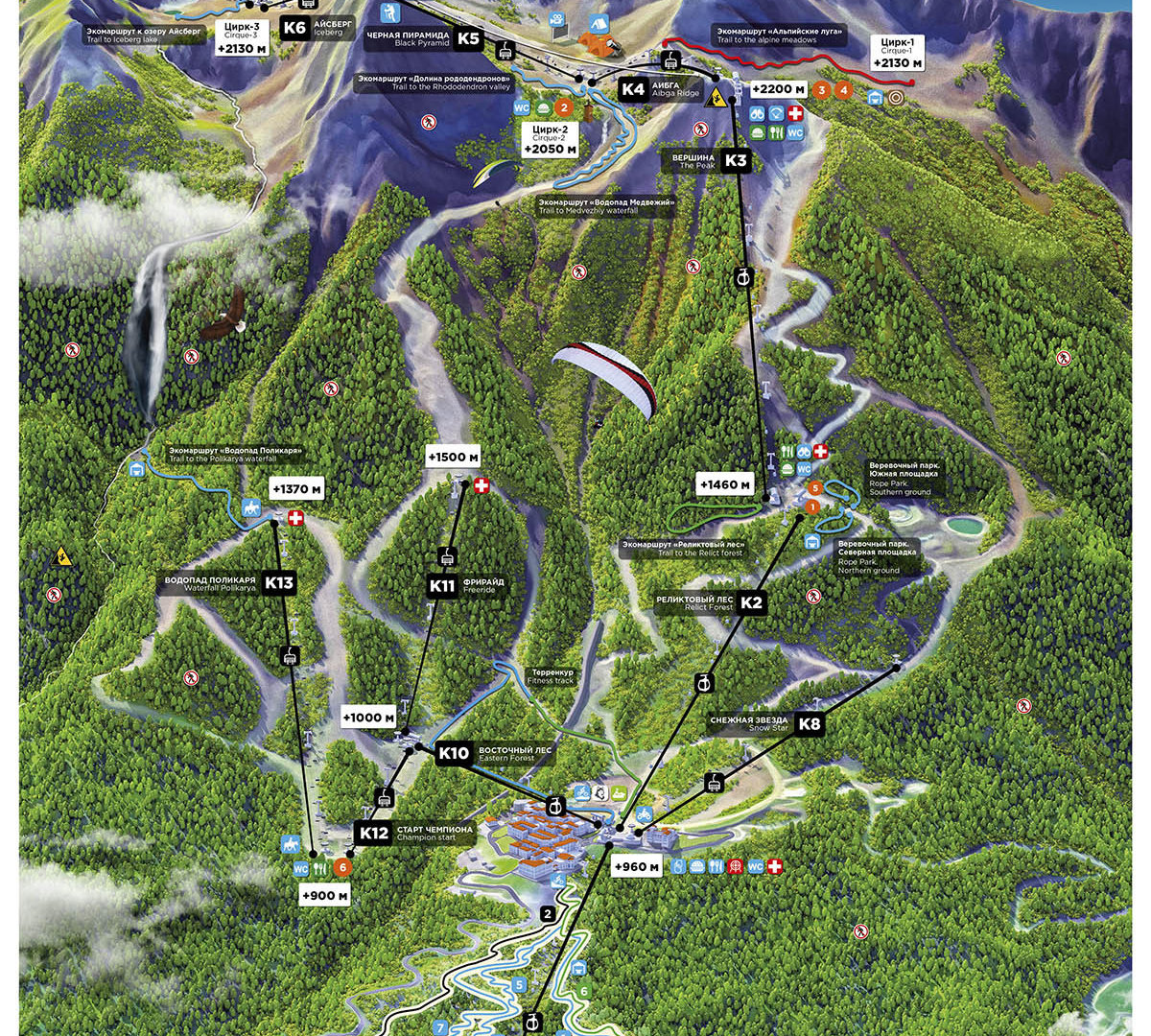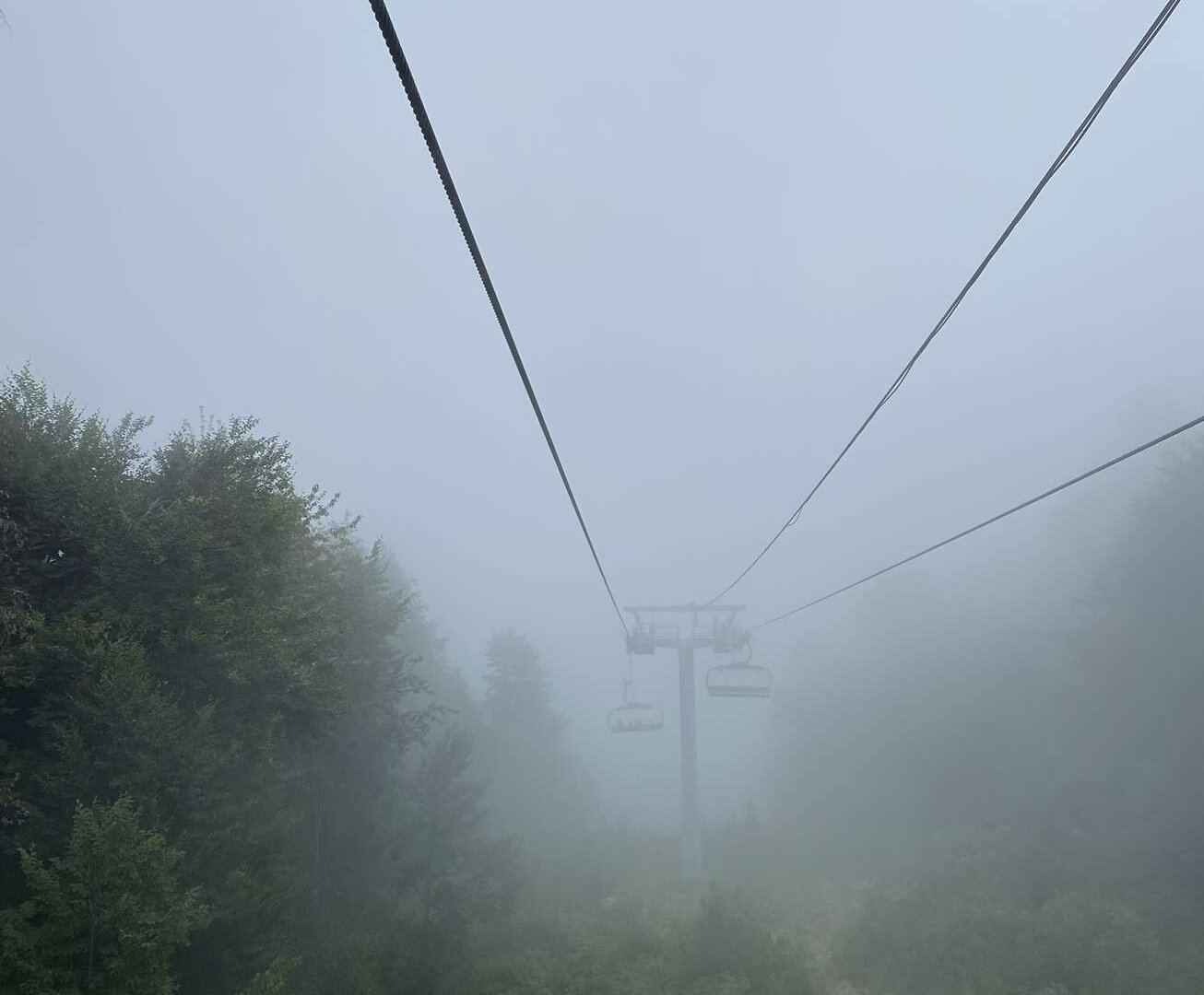 Начало было стандартным. Купили билет до Поликаря, поднялись на Горки город 960 и пересели на канатную дорогу Восточный лес. Поскольку ограничений по времени особо никаких не было и как минимум 960 работала до 23:00 мы переждали солнце и выдвинулись на канатную дорогу после обеда, ближе к четырем. День обещал быть пасмурным и уже начали набегать тучки. В общем, все как мы любим.