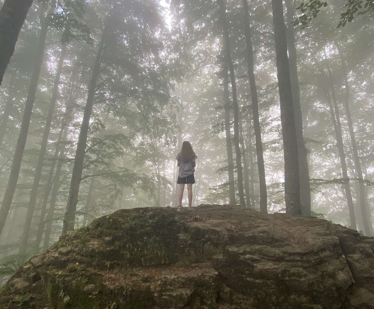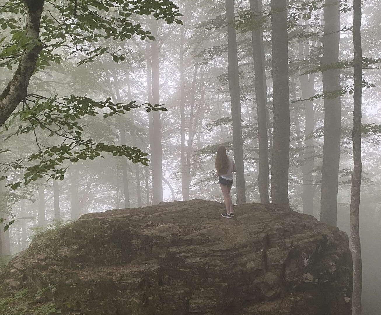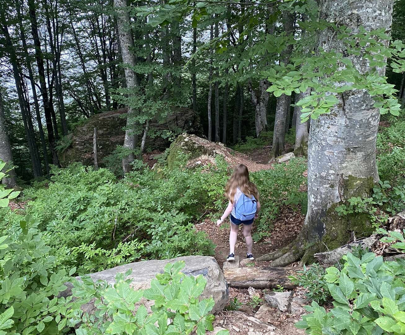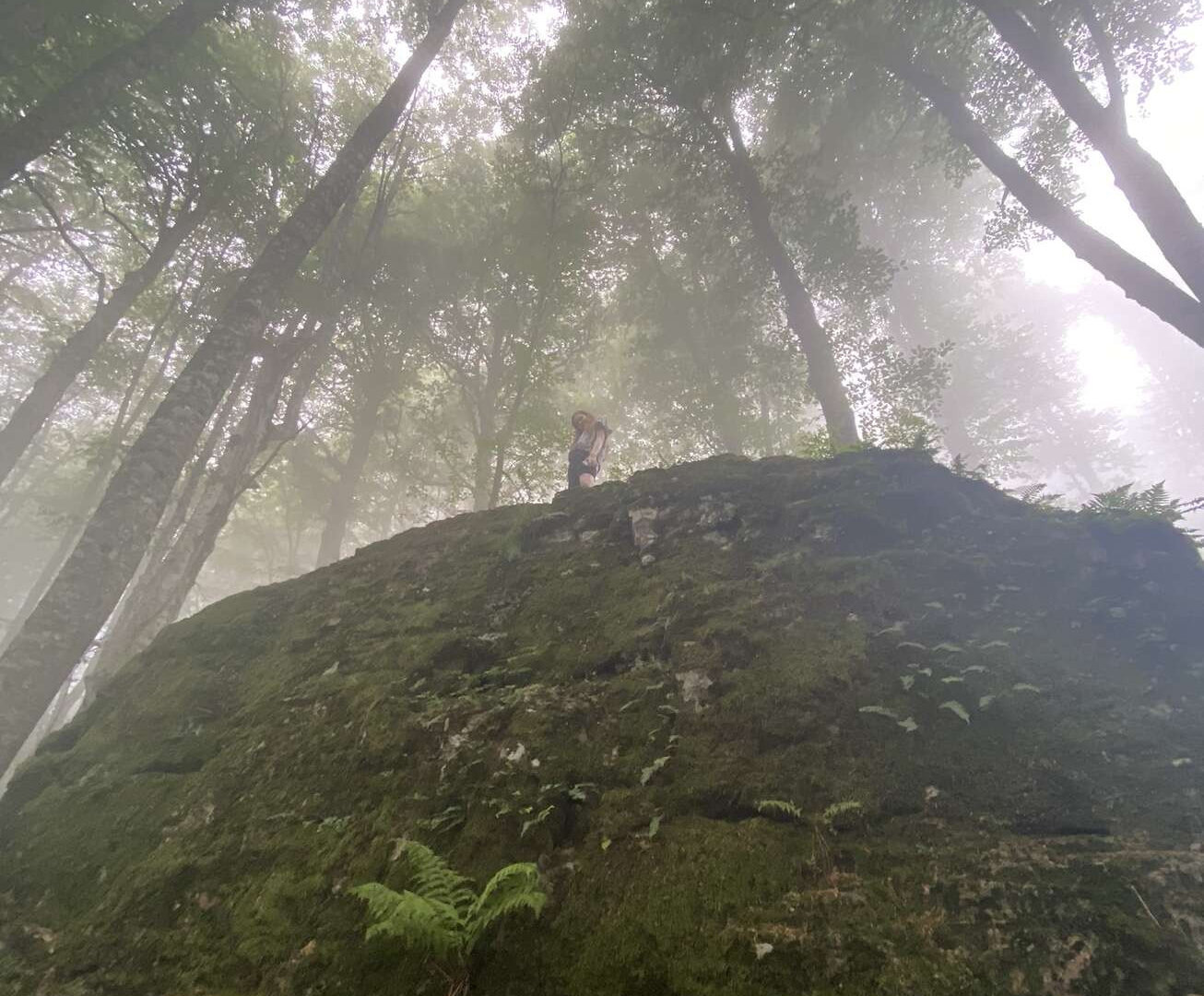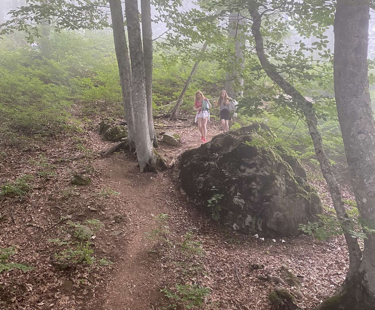 Пофотографировались, я попила воды (жива, пишу пост), пошли назад. В лесу виднелся очень фотогеничный камень и мы решили его обследовать. Ну как решили… Лидочка сказала: «Пойдемте же на камень!» И ломанулась вниз, легкая и грациозная аки горная козочка.
