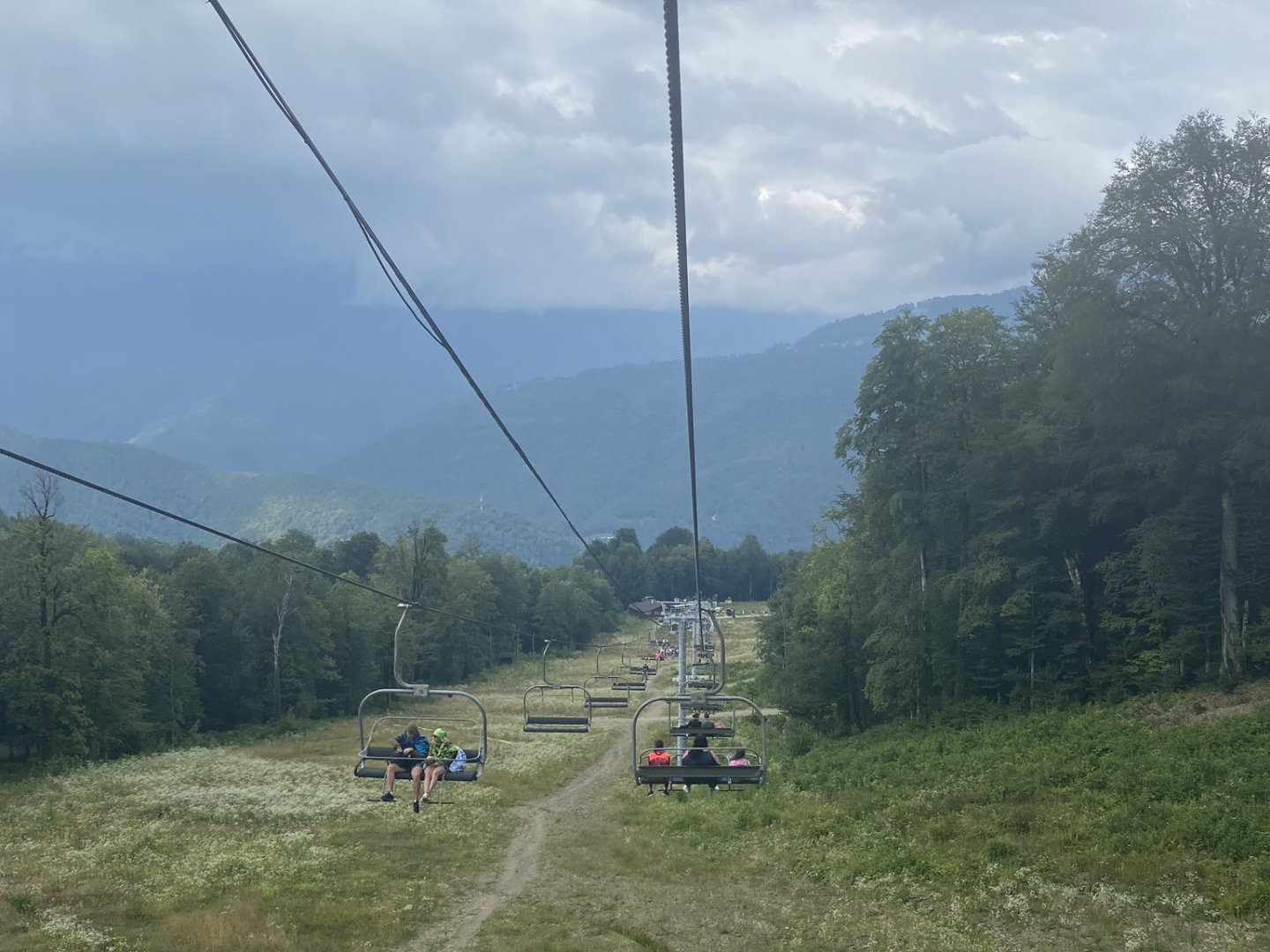 Отбившись от чихающей девицы, мы сели на кресельный подьемник и медленно медленно покатили с горы вниз. Скорость подьемника была такова, что пешком конечно спуститься бы было быстрее и если вы по каким то причинам торопитесь, то лучше пешком по дорожке. Там от силы метров 500 под уклон ровно под канатной дорогой.
