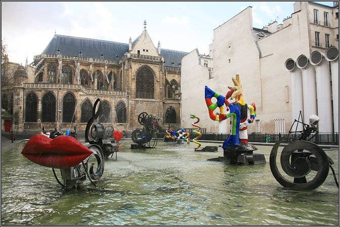 Но самая вакханалия, конечно, находится у центра Жоржа Помпиду :) Это центр современного искусства — модные инсталляции, авангард, кубизм и прочие нереальности. В соответствующем стиле выполнен и фонтан в скверике рядом. Сон Сальвадора Дали, бегущего за Пикассо с Матиссом наперевес.