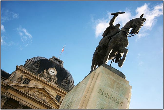 В Париже жило такое количество всяких известных людей, что, в общем, куда не пойди — везде наткнешься на памятные места, мемориальные доски и прочие скульптуры знаменитостей разного масштаба. Памятники всяким маршалам и генералам, наверное, во всем мире примерно одинаковы — человек в суровой позе, с суровым лицом, на коне с суровой мордой, сурово смотрит вдаль, видимо на трепещущего в страхе врага. Попутно еще указует куда-нибудь в пространство твердокаменным перстом, в назидание потомкам. А на затылок ему тихонько гадят голуби.