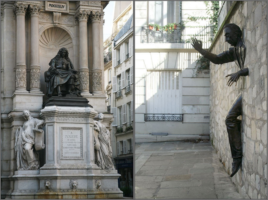 Вообще, по-моему, чем знаменитость масштабом поменьше — тем памятники ей повеселее. Вот, сравните, например, монументальный памятник Мольеру — ну почти маршал ведь, только без коня, и маленький памятник на Монмартре, на площади Марсель-Эме. Собственно, этот пятачок даже площадью сложно назвать, так, дворик. Мало кому известный писатель Марсель Эме написал когда-то книжку «Passe-Muraille» («Человек, проходящий сквозь стену»), ну и изобразили его так, чтобы никто не перепутал. Жан Марэ, кстати, изобразил. Я как-то не знал раньше, что он скульптор.