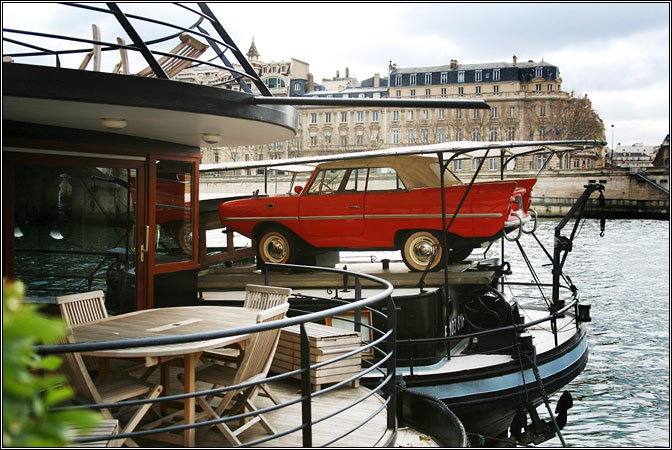На последнем фото — автомобиль-амфибия, так что даже такой вот симбиоз присутствует :) Вдоль набережной Сены, кстати, стоит огромное количество судов. Но они там не плавают, это просто жилые дома на воде. Говорят, жить в них очень дорого, но зато очень престижно. Вообще, цены на жилье в Париже довольно высокие... Но это уже другая история :)