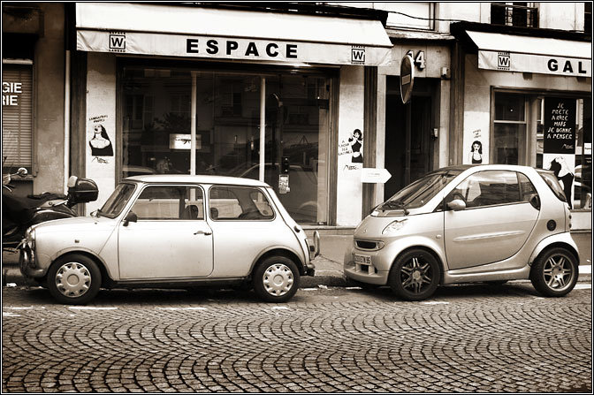 Ну и, конечно, Париж — город маленьких автомобильчиков. Начиная от современных ультракомпактов типа Smart-а, и заканчивая древними, но вполне бодрыми Rover Mini, Fiat 500 и прочими раритетами. Что, в общем, понятно — улочки по большей части там такой ширины, что даже средний Ford Focus там будет выглядеть как слон в посудной лавке. Движение организовано правильно — все узенькие улочки односторонние, то есть серьезных заторов почти не бывает, но для туриста на прокатном автомобиле разобраться в маршруте будет сущим адом. Спасет только GPS :)