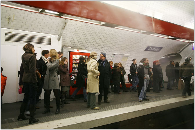 В Париже 14 веток обычного метро и 5 — скоростного. Обычное метро ходит в пределах кольца, стоимость билетика — 1.60 евро за поездку. Говорят, что дешевле покупать книжечку из 10 билетиков, но мы столько на нем просто не катались — по причине пешеходности города. Разобраться в схеме движения, в общем, довольно несложно, хотя многое мешает — остановки в вагонах не объявляются, световых табло тоже нет, нужно глядеть в окна и следить за названиями станций, чтобы не пропустить свою.