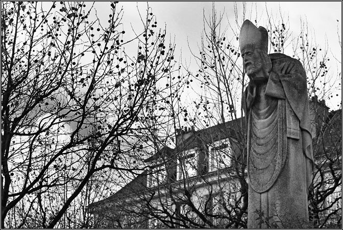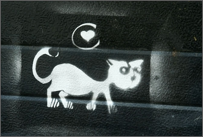 Причем это была очень цивилизованная кошка — она сидела посреди тротуара, демонстрируя аккуратный красненький ошейник и разглядывая птичек, а заметив меня с фотоаппаратом — некоторое время попозировала, задрала хвост трубой и чинно прошествовала мимо к ближайшей калитке. Парижане сами причем явно чувствуют, что кошек у них маловато, и стараются компенсировать недостаток их изображениями и скульптурами, попадающимися на каждом шагу. Причем иногда в самых неожиданных местах и странного вида :)