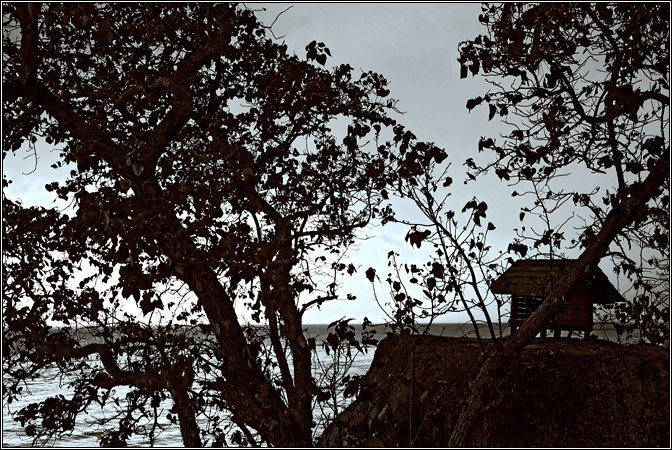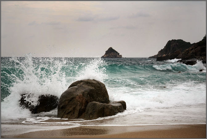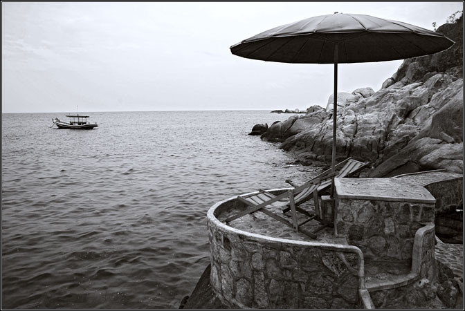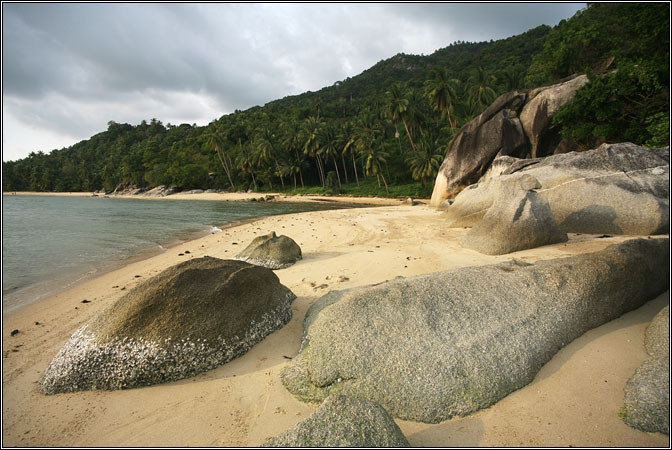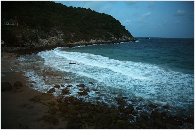 По прибытию взяли мотобайк прямо у пирса, погрузили на него все шмотки, погрузились сами и отправились на поиски. Ко-Тао — остров маленький, но очень горный. И дороги там очень горные. А в большинстве случаев, за исключением дороги у пирса и пляжа Sairee, их там вообще особо нет — так, широкие каменистые тропы с жутким перепадом высот и колдобинами. В общем, старый знакомый Honda Click ехал по всему этому делу с большим трудом, постоянно скребя совсем не горными покрышками, спотыкаясь и подвывая. Но добрались. Бухта оказалась на самом деле красивой — мощными скалами по краям был обрамлен миниатюрный залив, украшенный могучими валунами по белому песку. Высокие волны били в скалы, взлетая мириадами брызг... Купаться было невозможно :)