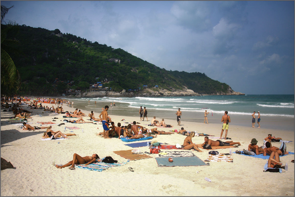 Сам пляж же, на котором это действо происходит — самое густозаселенное место, которое я видел в Таиланде. Днем там иногда бывает как у нас на югах — плотная укладка голого населения по песку. Причем в 500 метрах, на другой стороне острова (это самое узкое место) — тишина, покой, огромные пустые дикие пляжи, на которых ты можешь сидеть и не видеть никого вокруг за полтора километра. Только пальмы, песок и море. Там мы и жили с Ирой, снимая очередное бунгало. Самое комфортное из тех, что у нас были, потому что у него был персональный гамак на крылечке :)