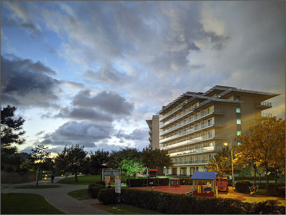 Отель — большой, занимает обширное пространство и выглядит как отдельный городской микрорайон. У него 12 восьмиэтажных жилых корпусов, плюс на территории находится куча всяких ресторанов, магазинов, бассейнов, детских площадок, турагентств, аттракционов, пунктов проката и черт знает чего еще, я не особо заморачивался с изучением.