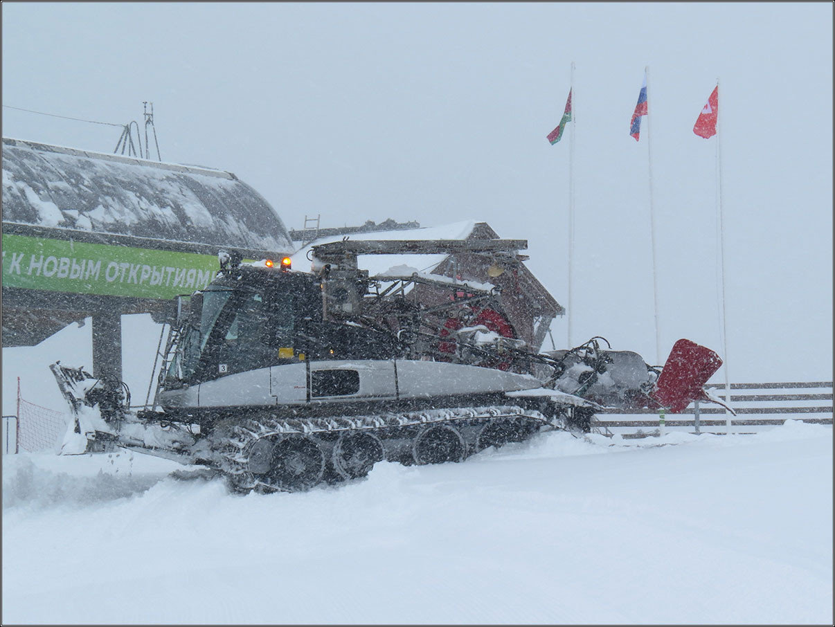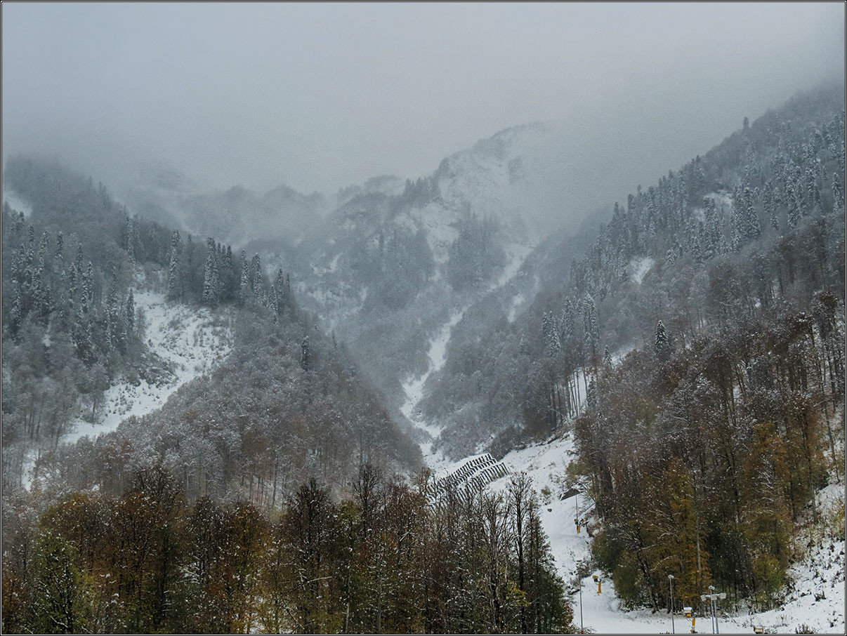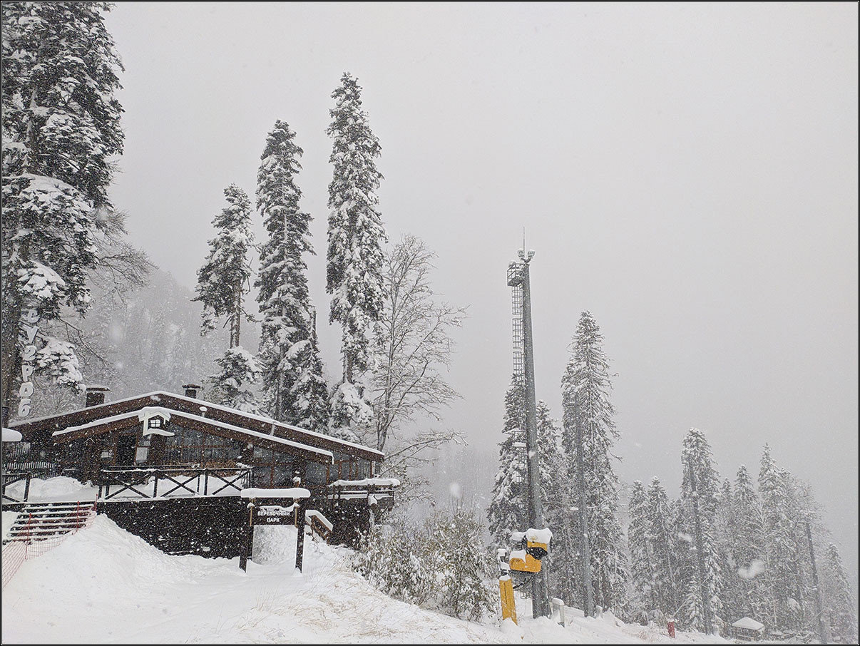 Всесезонный Сочи — это когда приезжаешь в горы с побережья, где была более-менее теплая осень, а там — зима. И не просто зима, а прямо вот Зима с большой буквы: метель метет, сугробы по колено, ни зги не видно, ратраки чистят тропинки, чтобы хоть как-то ходить можно было, у подъемников все окошки залеплены снегом, ты ходишь, проваливаясь в своих летних кроссовочках, и пытаешься еще что-нибудь сфоткать, поминутно протирая объектив от тающих снежинок.