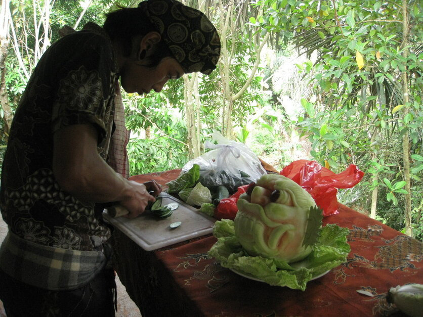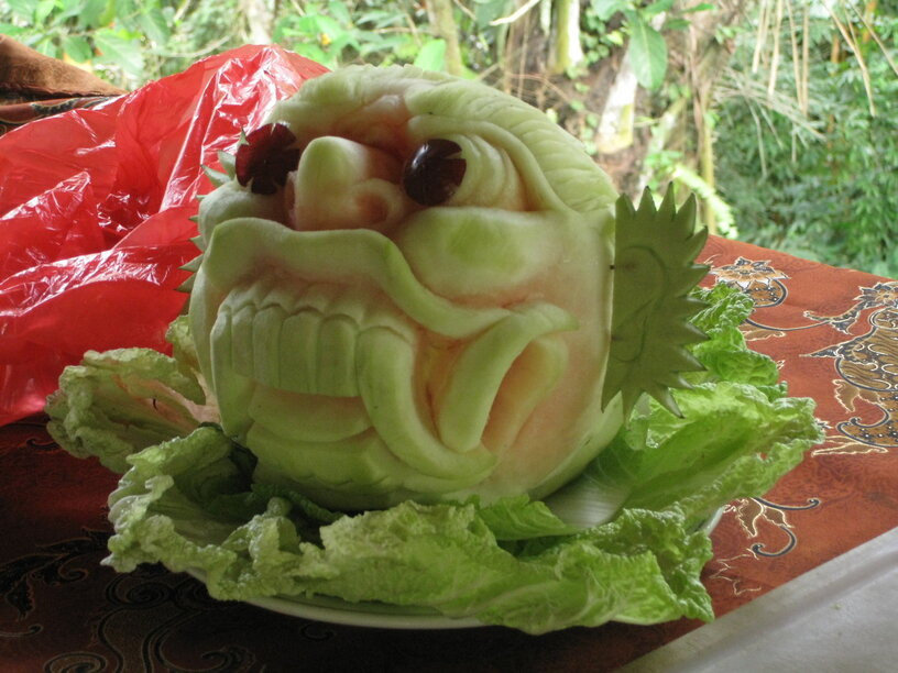 Однажды на одном празднике я заметила, как какой-то парень ловко вырезает что-то из арбуза. Притаилась с фотоаппаратом в сторонке и стала свидетелем рождения Арбузного монстра:) Надо сказать, что балийцы- весьма искусные мастера по части вырезания из дерева и камня всяческих шедевров. А уж арбуз порезать красиво им легче лёгкого.