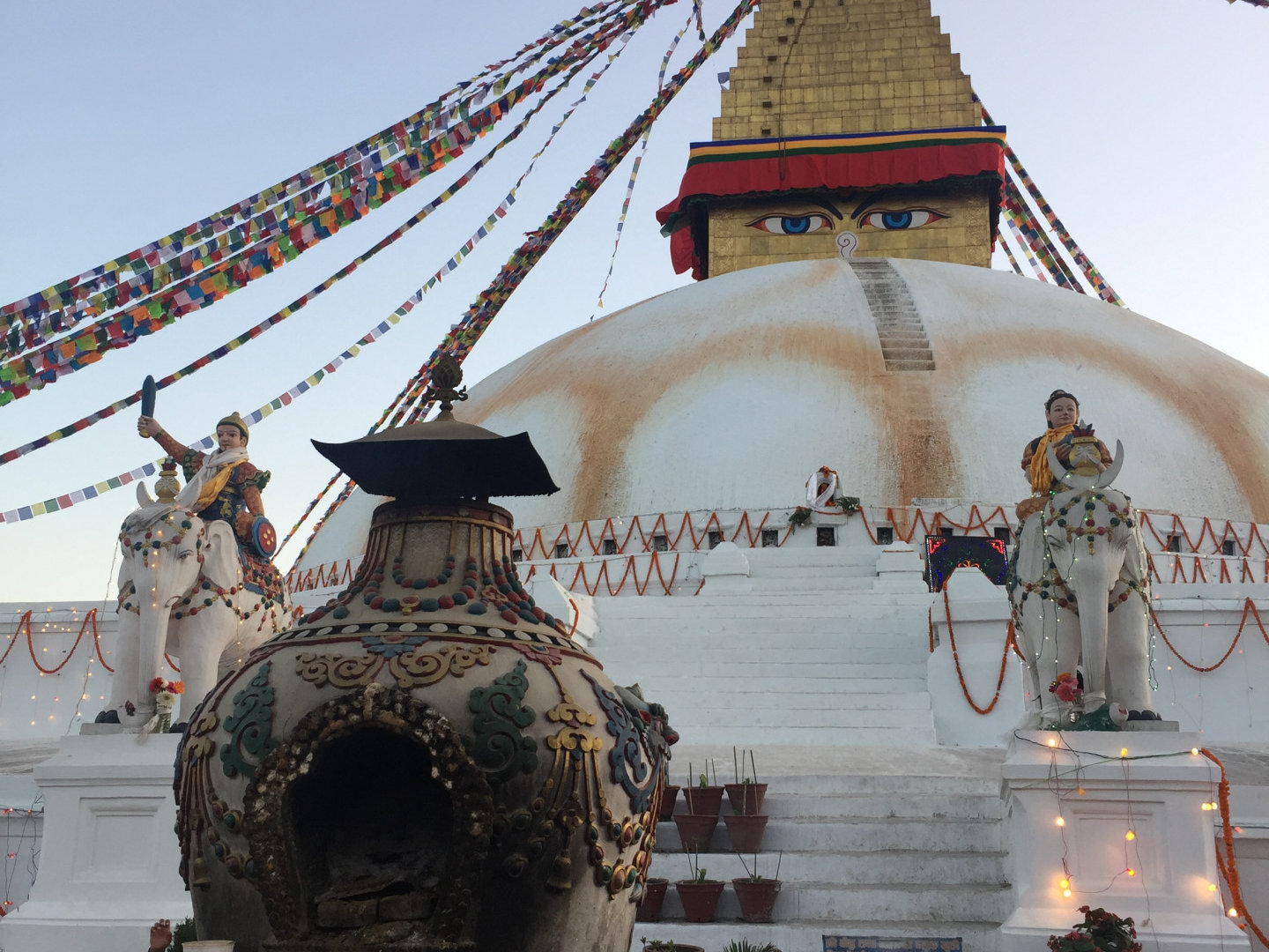 День начал постепенно угасать, и золотой цвет шпиля красиво заиграл в лучах уходящего солнца. Изображенные под куполом на четыре стороны света Глаза Будды внимательно смотрели абсолютно на всех, излучая сострадание и любовь к малейшему проявлению Божественного начала.