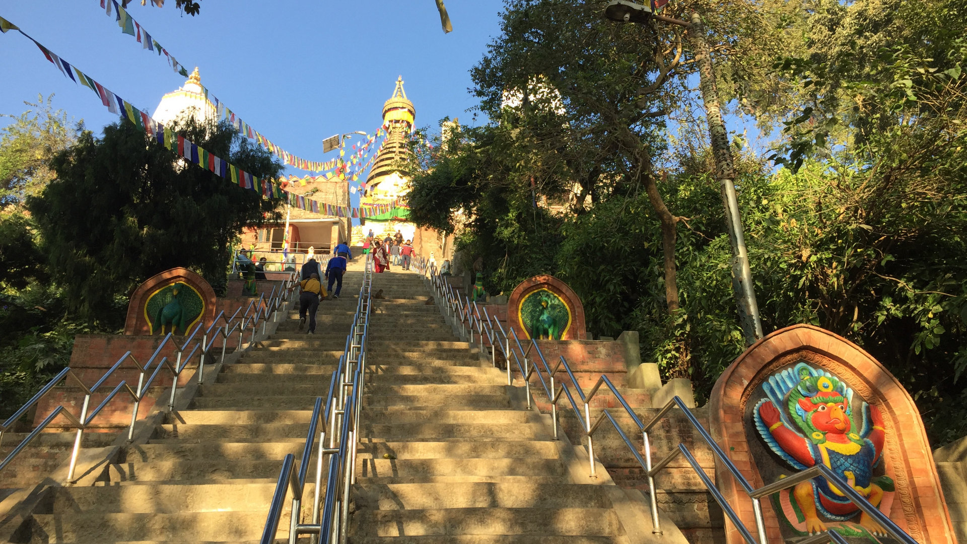 От входа на территорию храма к его главной площадке вела крутая и длинная лестница. Где-то читал, что количество ступеней соответствует числу дней в году. Но, честно говоря, проделанные шаги я не считал, а просто карабкался вверх, пытаясь успеть одолеть подъем до первых лучей солнца. За перилами по обе стороны от лестницы располагались фигуры различных священных культовых животных и мифических созданий. Не смотря на то, что Сваямбунатх храм буддийский, на его территории нашлось место и для святилища индуистов, по этой причине статуи Будды тут соседствовали с Шивой и прочими индуистскими божественными представителями.