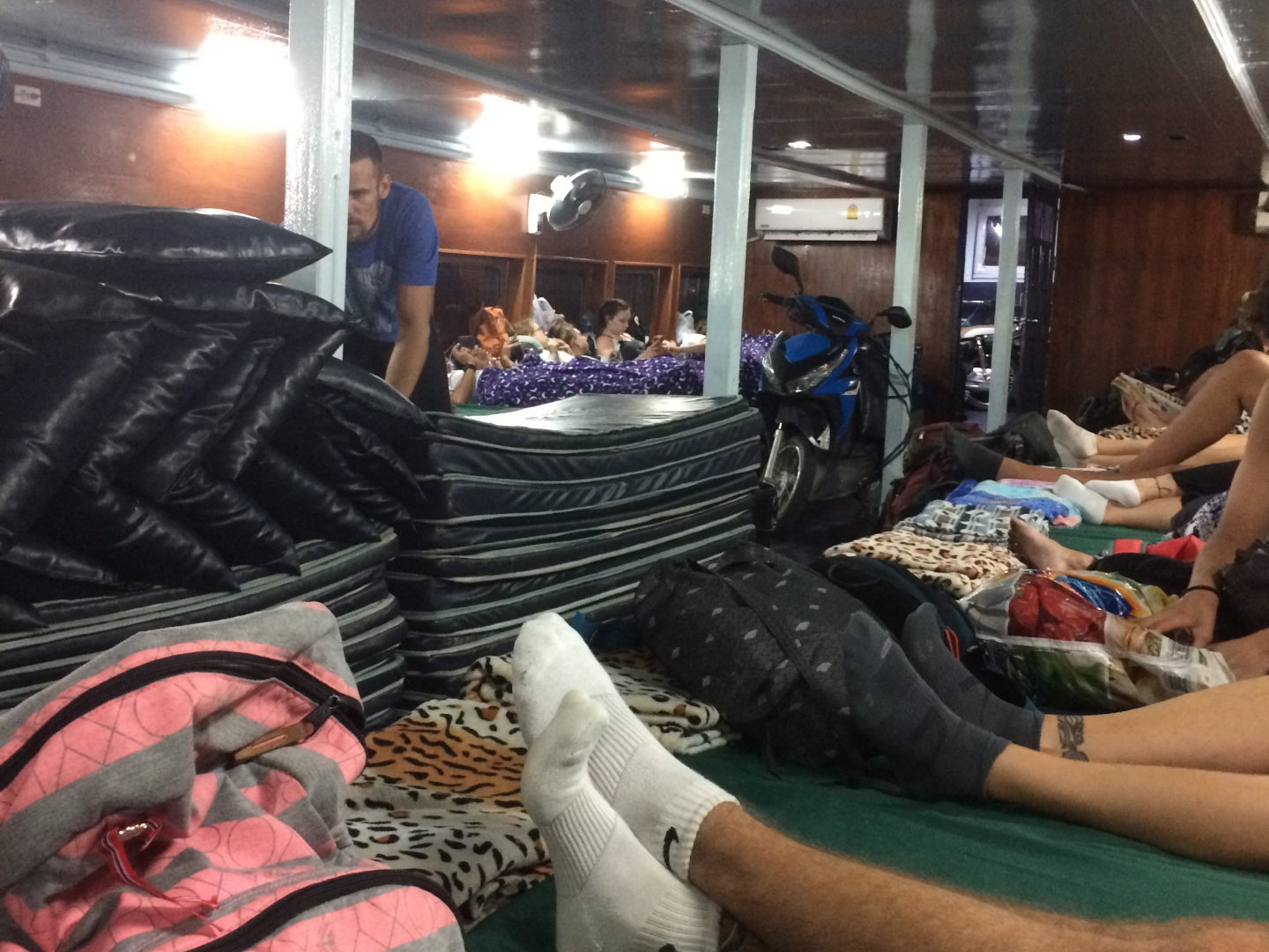 Не могу не рассказать о замечательном ночном пароме, на котором мы плыли с Кхо Тао до порта Сураттхани. За бортом бушует стихия, а ты спишь — великолепно. Напоминает наш плацкарт.