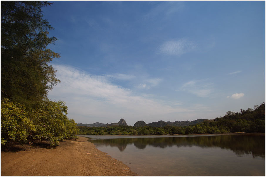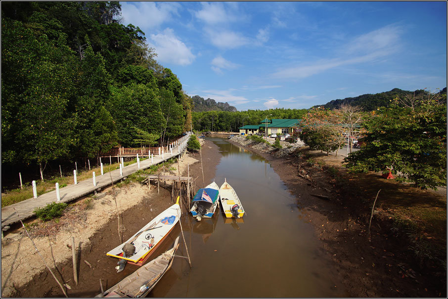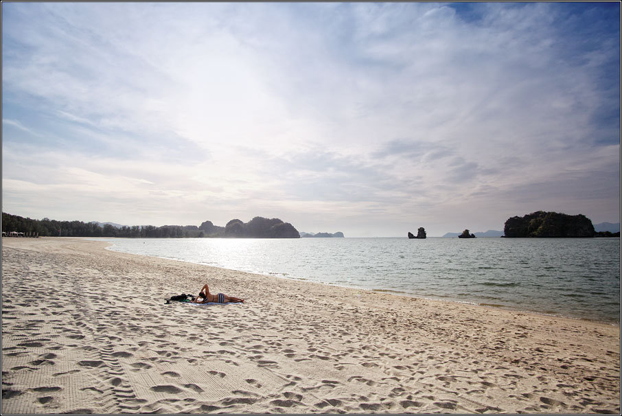 23.01.2013Продолжали сегодня изучать остров Лангкави, объехав его на этот раз с восточной стороны. Нашли большой грузовой порт. Нашли речку, забитую катерами, на которых предлагается эту речку исследовать, нашли заросли мангровых деревьев, заботливо обнесенных мостками — чтобы возить туда туристов на просмотр. А совсем на севере острова нашли лучший пляж: Tanjung Rhu Beach. Километра полтора широченной полосы чистого белого песка, острова на горизонте, скалы по краям, маяк на скале, летающие над головами орлы... и никого. На пляже в какой-то момент мы остались вообще вдвоем, не считая невесть кем забытого ярко-желтого пластикового стула :)