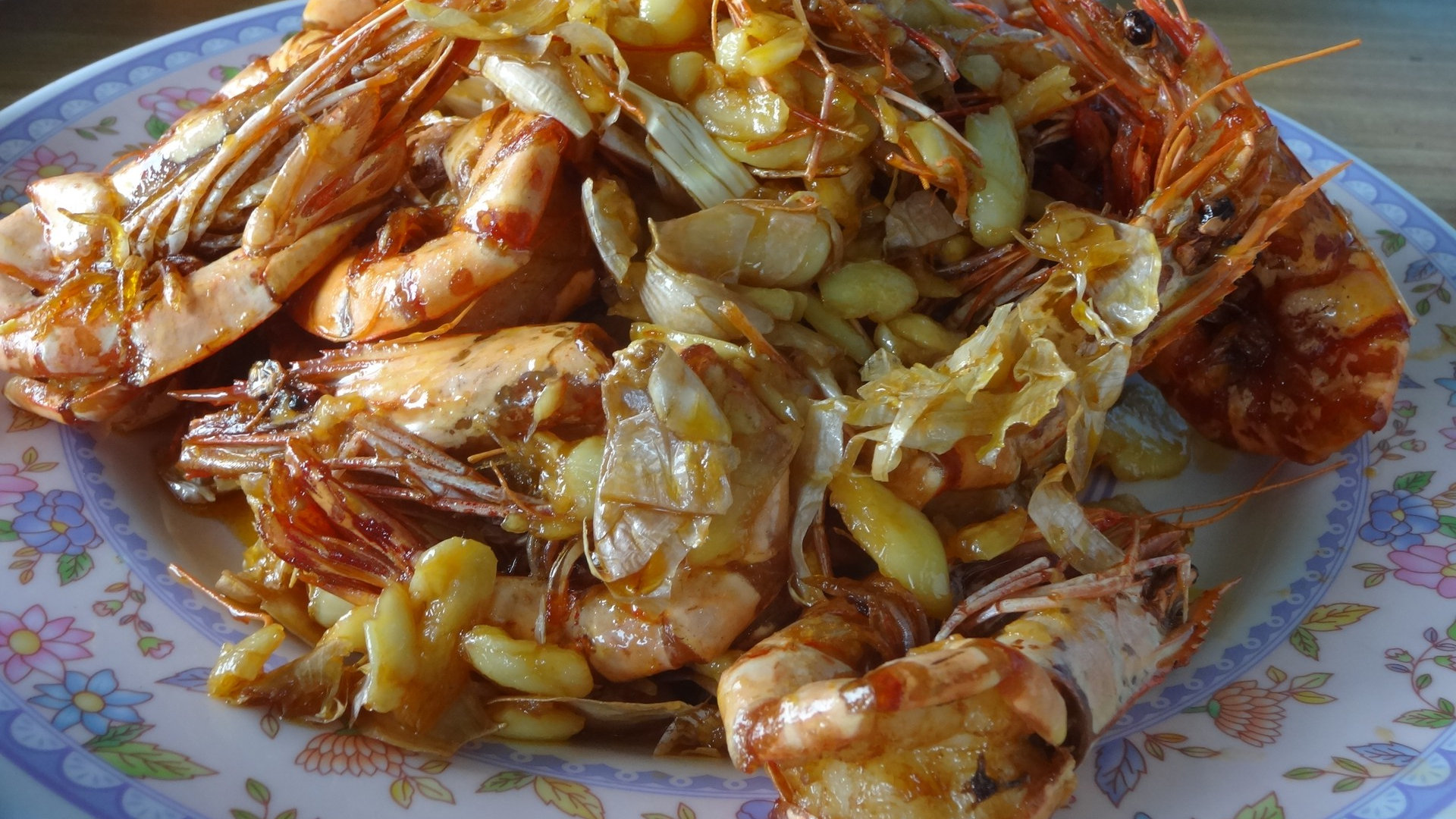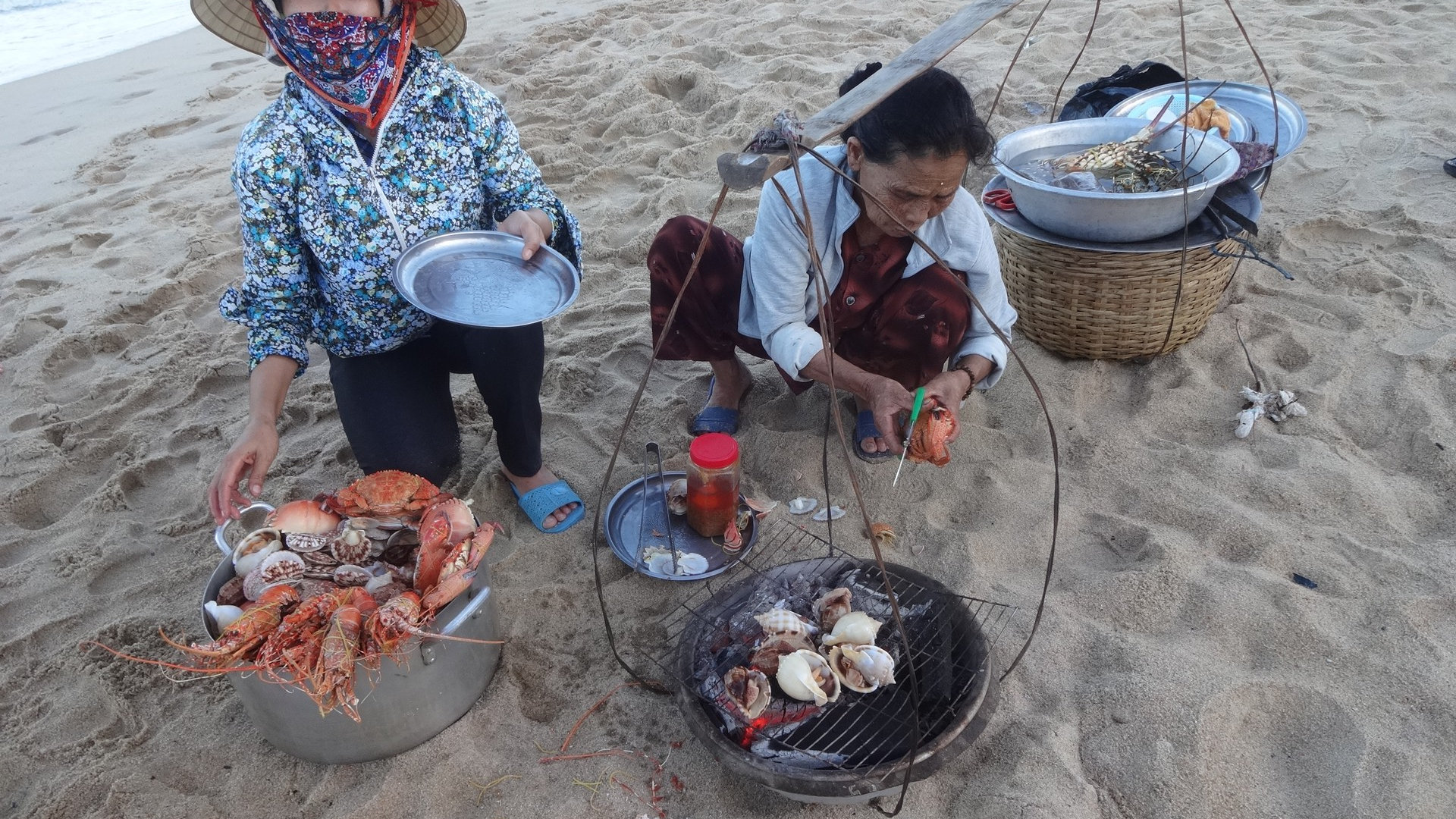 По дороге есть небольшой сквер с фонтанами, дальше еще несколько скверов. На Северной стороне можно купить и вам приготовят свежие морепродукты, которые плавают в тазах с подачей воздуха. Первая линия к мосту дорогие кафе, дальше дешевле. Лучше туда идти днем. Тогда все кафешки чистые и людей нет, а вот вечером там сотни местных и такая грязь, что мысли не возникает там кушать. Мы многие морепродукты даже не знали, как называются, поэтому взяли королевских креветок – нам их пожарили с чесноком – 200тыс донгов за килограмм, а жарят бесплатно.