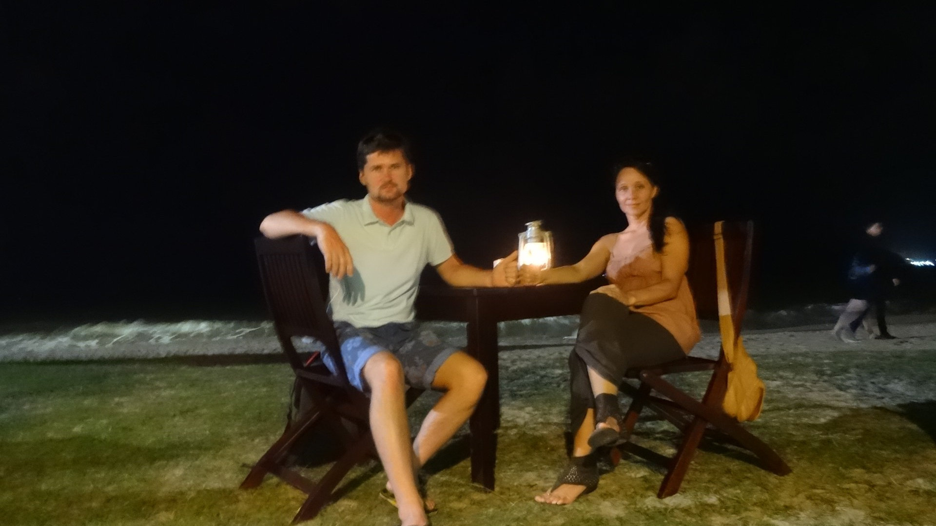 Побродили по городу и пошли на набережную к «Парку Горького» и «Луизианне». Там в кафешке на песке при свечах заказали чай, кофе. Ели свои фрукты. Рядом шумит море и огромные волны — красота.