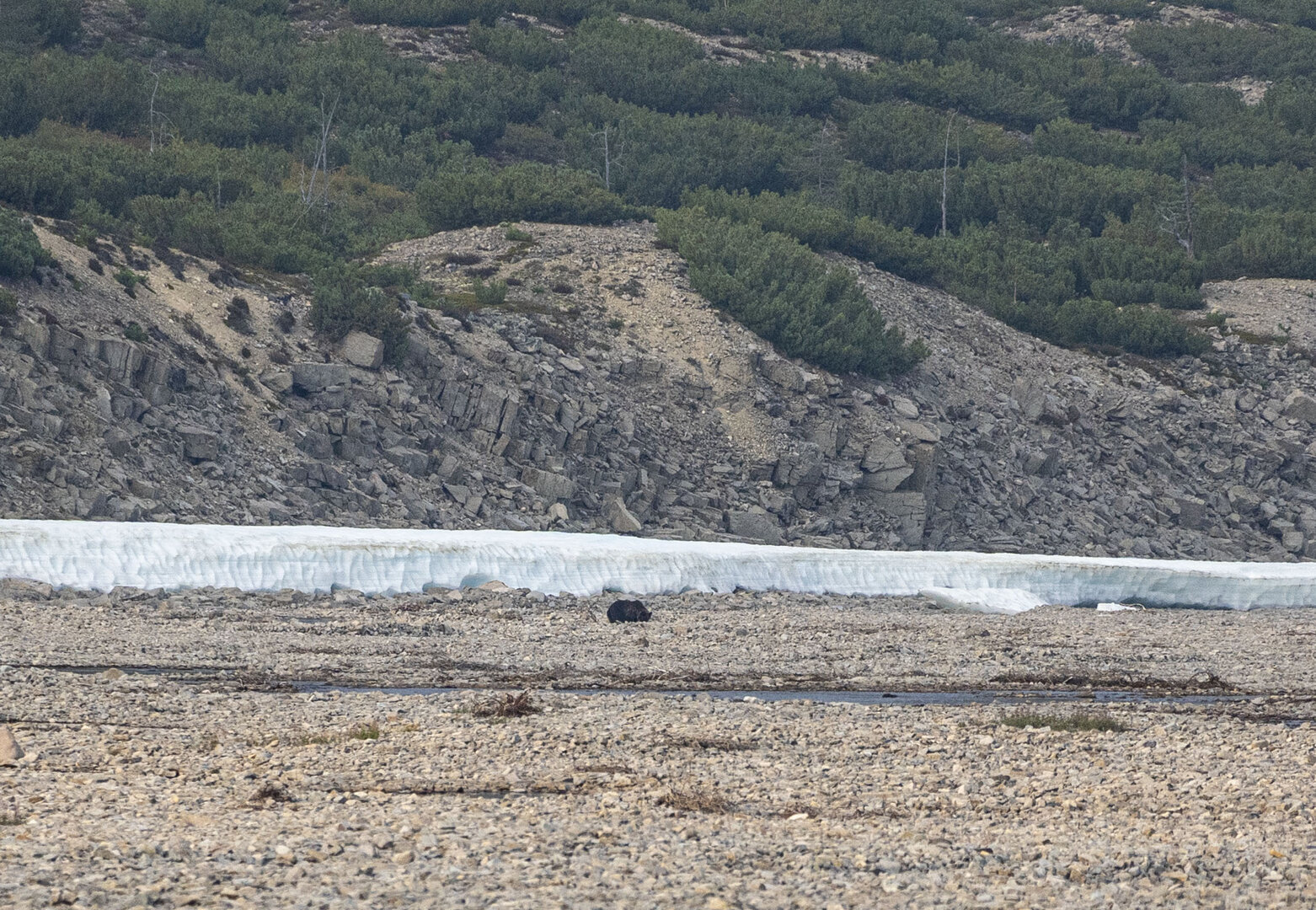 Вот тут на фото видно медведя так, как мы его видели — маленькая точка у наледи.