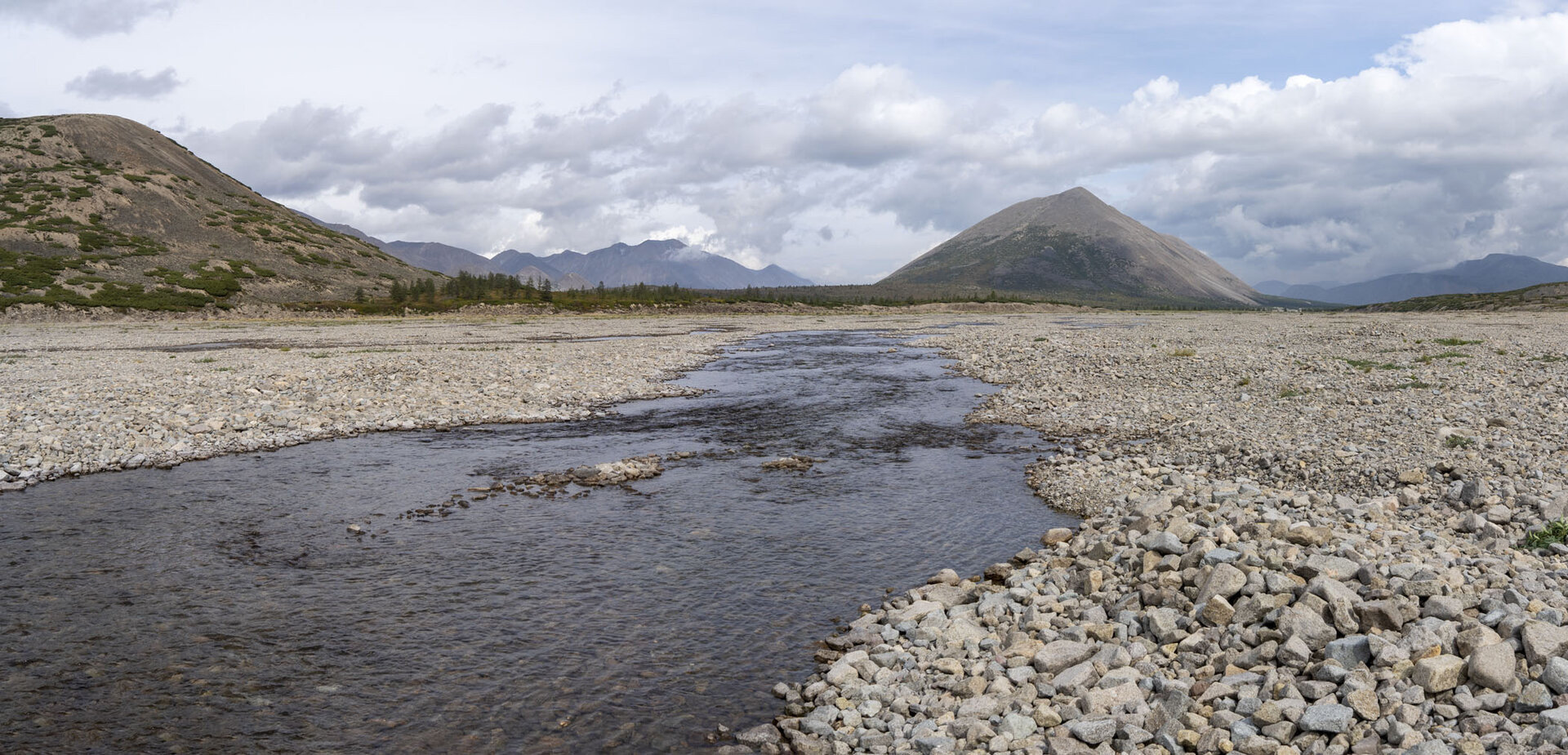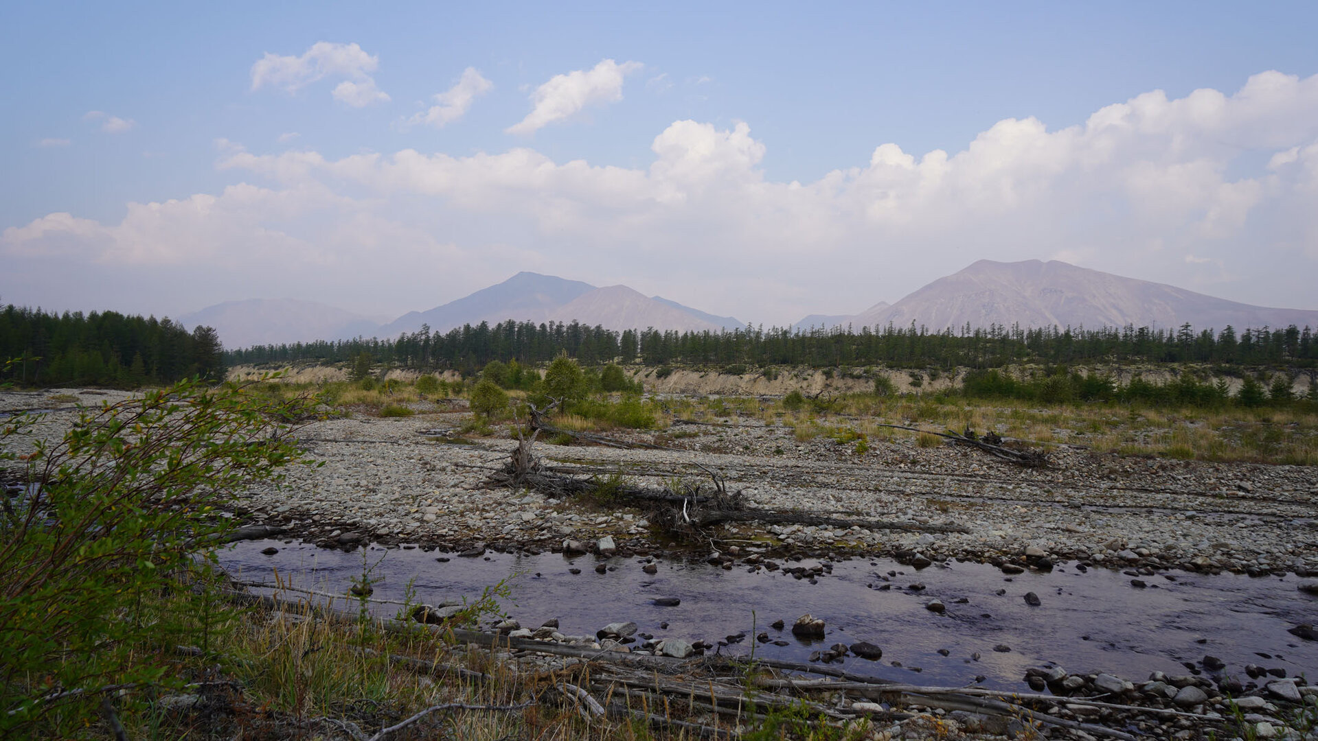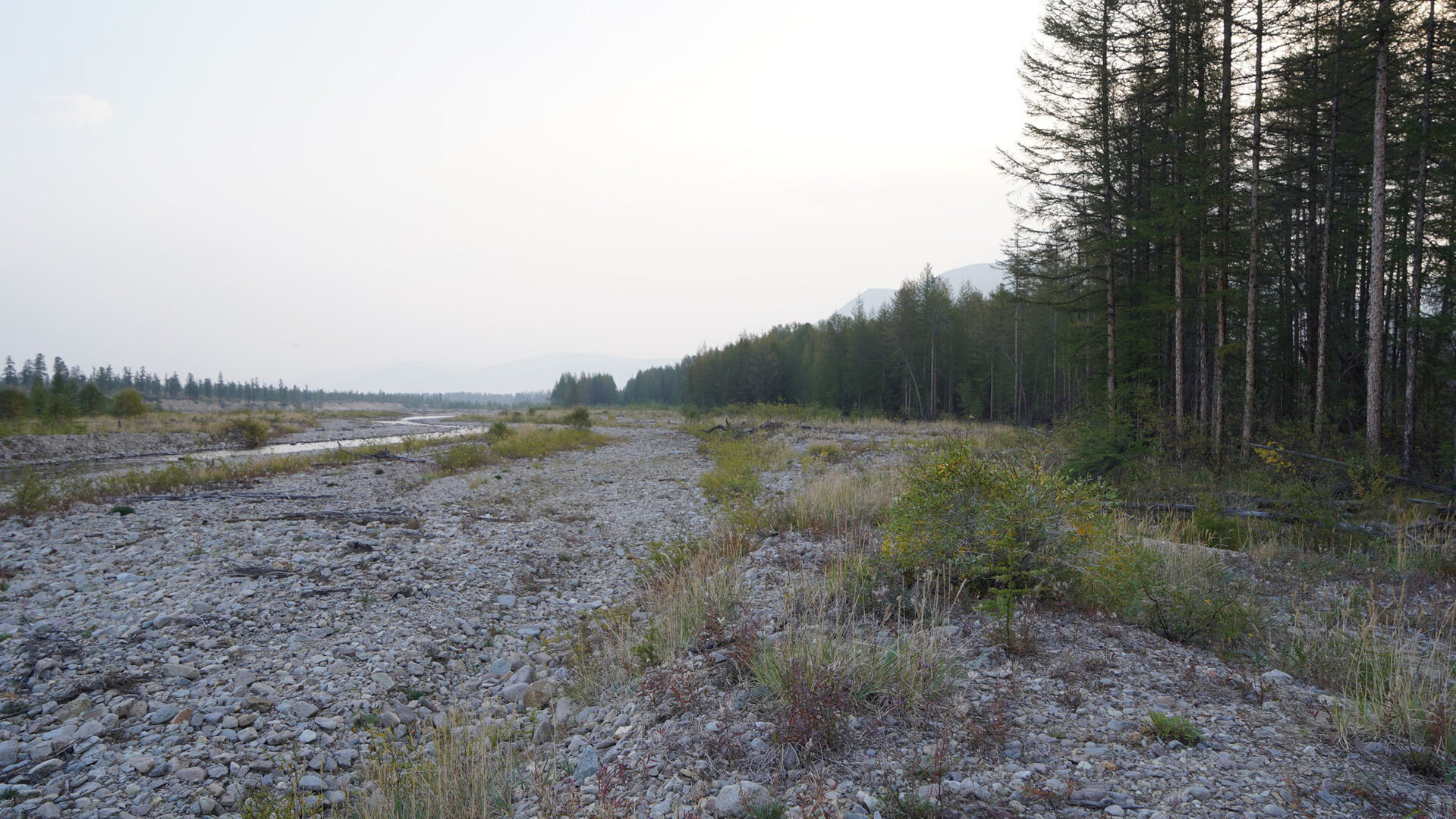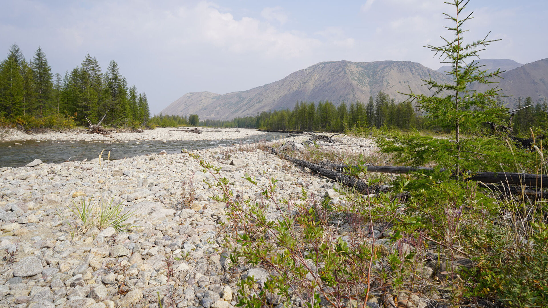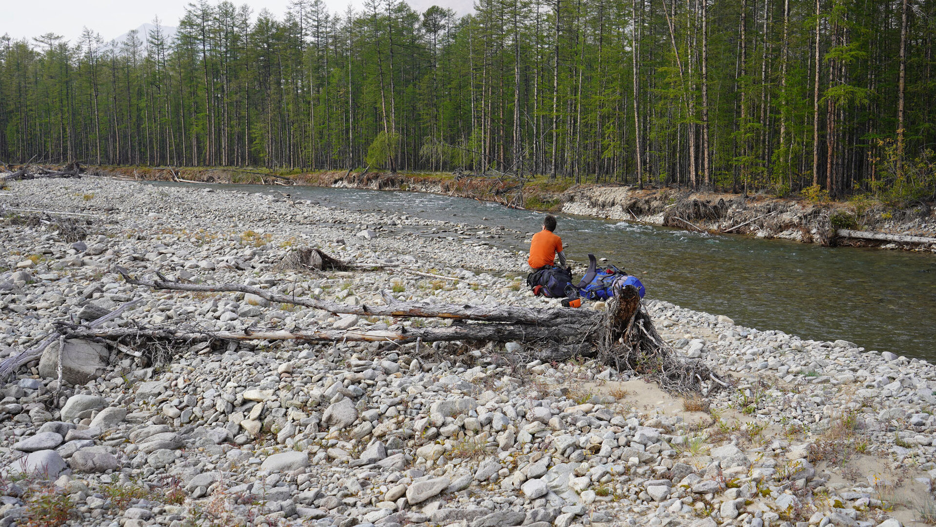 Выходим примерно часов в 10-ть. Мышцы уже подзабились, ноги в мозолях, хочется отдыха, но мы же помним — у нас отставание по графику. Сначала по лесу, потом снова по горельнику. Идется достаточно быстро, хорошо. Потом выходим на галечник к реке и идем там. Рельеф намного легче, чем в первые пару дней. Обедали у реки на галечнике, как раз там, где на обратном пути поймали себе на ужин крупного хариуса.