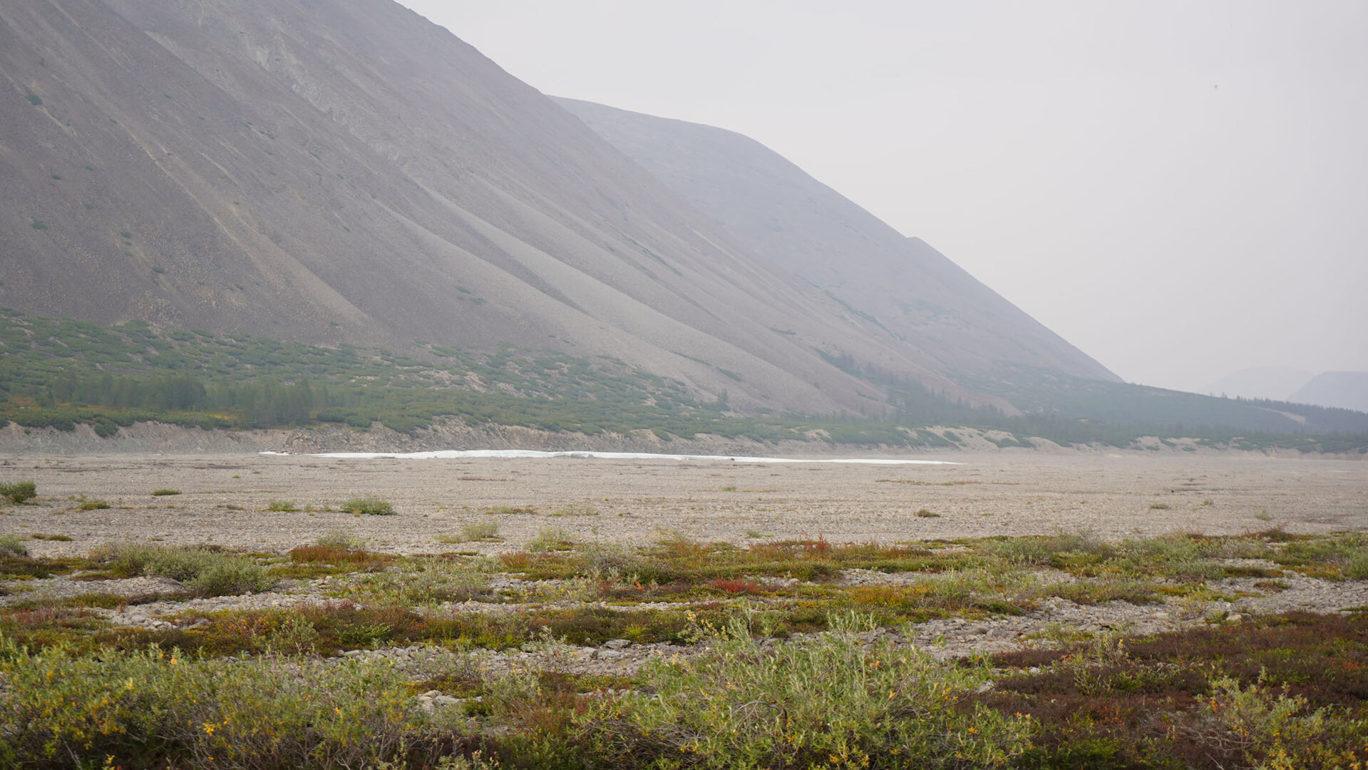 Надо выбираться из леса! С этими словами раненько утром, не раскачиваясь особо выходим часов в 8-мь! Всего за минут 20 выходим из леса, а еще за 20-ть проходим прижим и выходим на открытое пространство! Для нас это просто кайф — выбрались из леса! Идем по галечнику долго в поисках всё-таки второй наледи по карте, но ее все нет. Наледь почти вся растаяла. Но наконец-то находим остатки и опять обедаем у наледи. Там хоть немного сдувает мошку и можно хоть как-то отдохнуть. После этого выходим на терраску, а там горелый лес. Для нас это вообще бульвар в плане передвижения, но правда места лунные — жуткая картина. Включаю GPS на своих часах, наша скорость в среднем 4-5 км/ч. Это не плохо для туриста с рюкзаком.