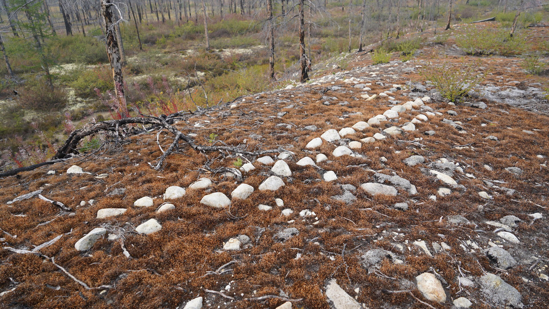 По пути находим удивительную картину — камни выложены аккуратненько там один за другим в два ряда. Стало интересно. Камни выложены давно, успели обрасти мхом, который потом сгорел вместе с этим лесом.