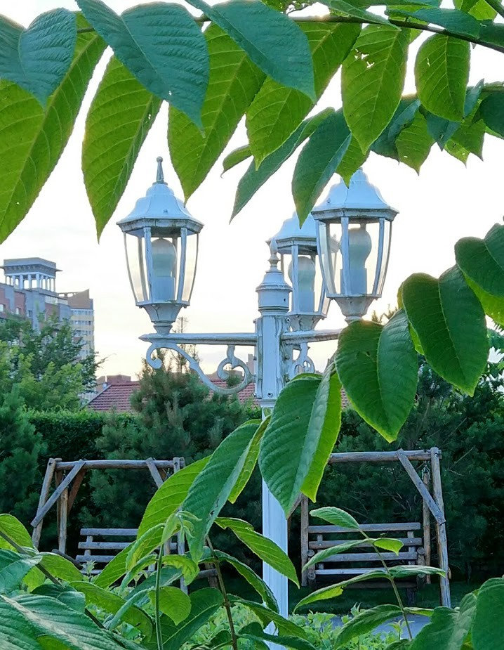 Еще не загорелись фонари, а солнце уже подсвечивает зелень вечерними золотистыми лучами.