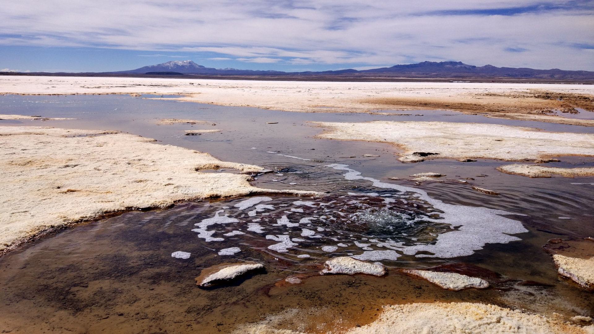 От входа в солончак, который обозначается памятником всем погибшим в этой пустыне, можно пройтись 1.5 километра до места под названием Ojos de Sal -20.311775, -66.997058 (гугл-переводчик говорит, что это «соляные глаза»). Это небольшие источники, из которых пузырится солёная вода.