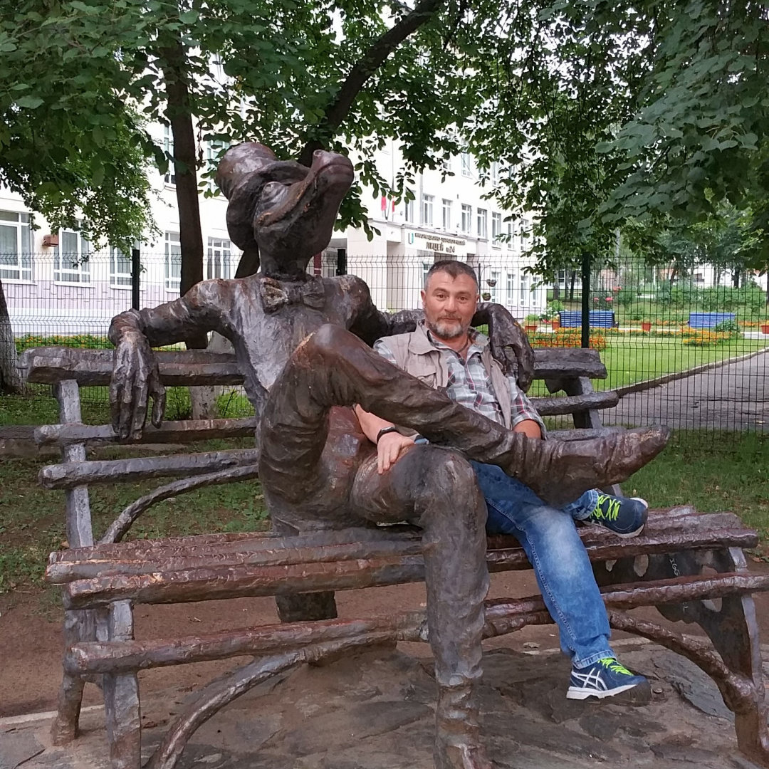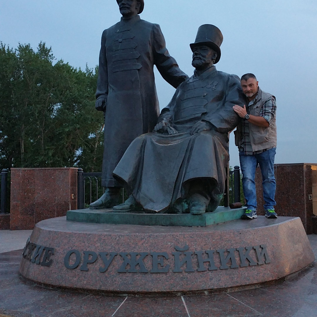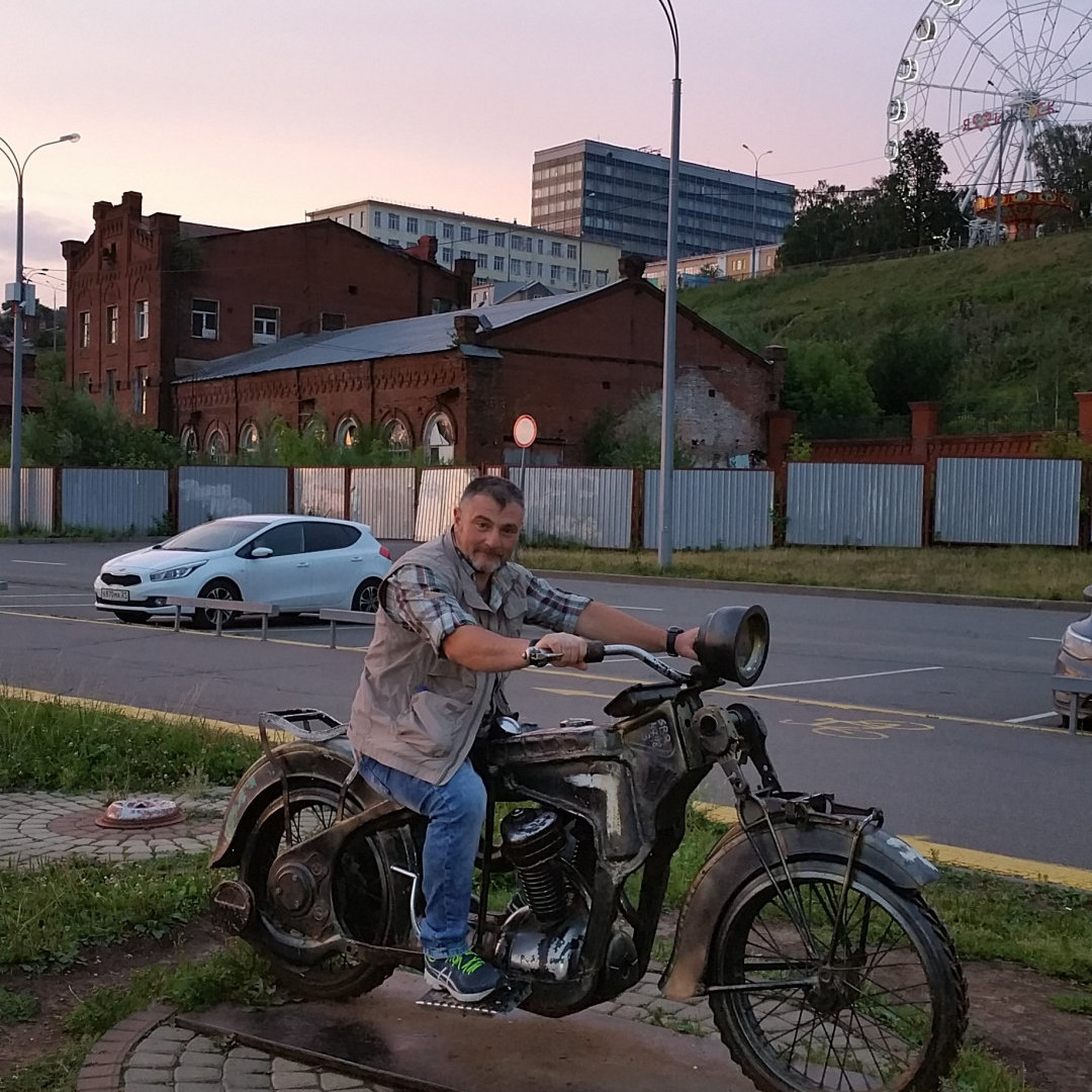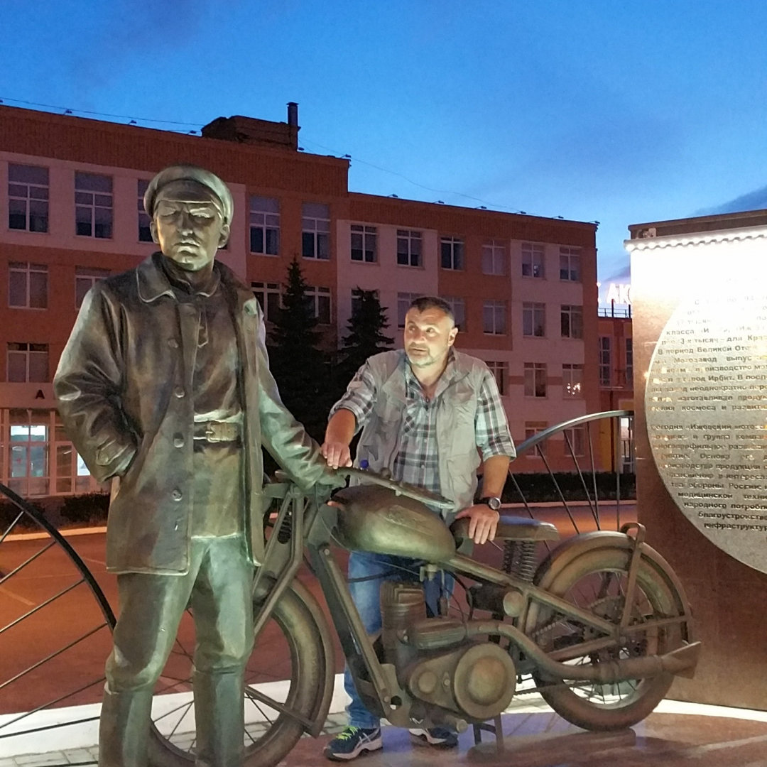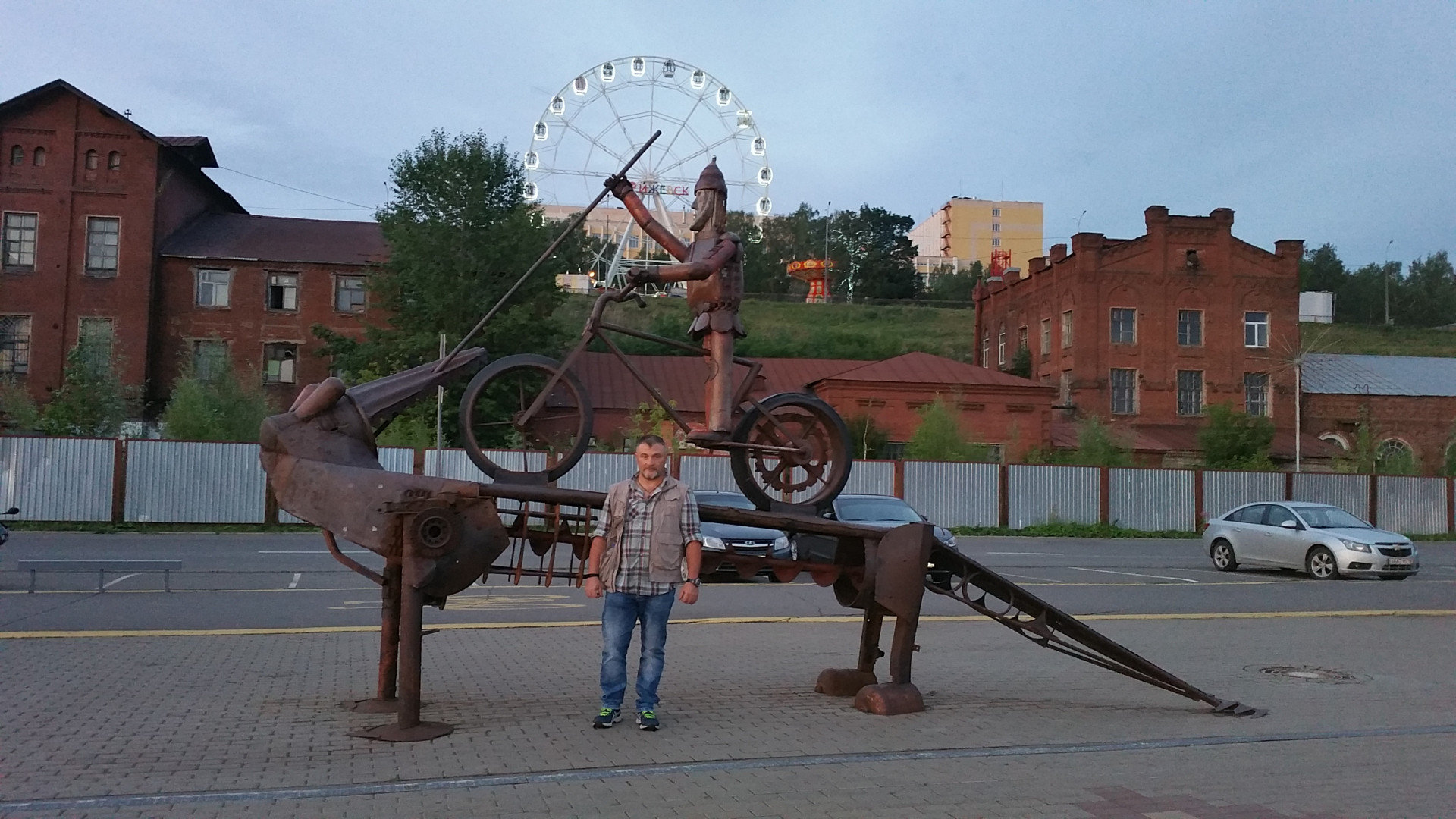 Да, наш пруд далеко не море, но закаты там изумительные, не хуже, чем на морях-океанах. Кроме того, набережная интересна оригинальными инсталляциями. Педро всерьез стал знакомиться с конструкцией нашего мотоцикла, потом детализируя его изучение уже на другой скульптуре и завершив в музее оружия и мотоциклов. В нашей обязательной программе изучения города оружейников были два музея этой тематики – каждый наш гость непременно их посещает, а показать их испанцу было просто святым делом!