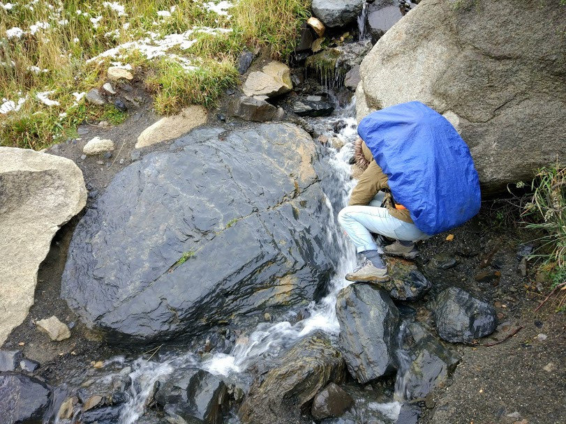 Так как до наступления темноты было ещё больше часа, а сидеть без дела не позволяла погода (мы поднялись довольно высоко и температура тут была ниже, чем в долине), то мы заняли себя прогулкой к ручью с питьевой водой. Вода в парке везде условно питьевая, так как течёт на прямую с ледников — мы пили сырую воду без последствий для организмов.