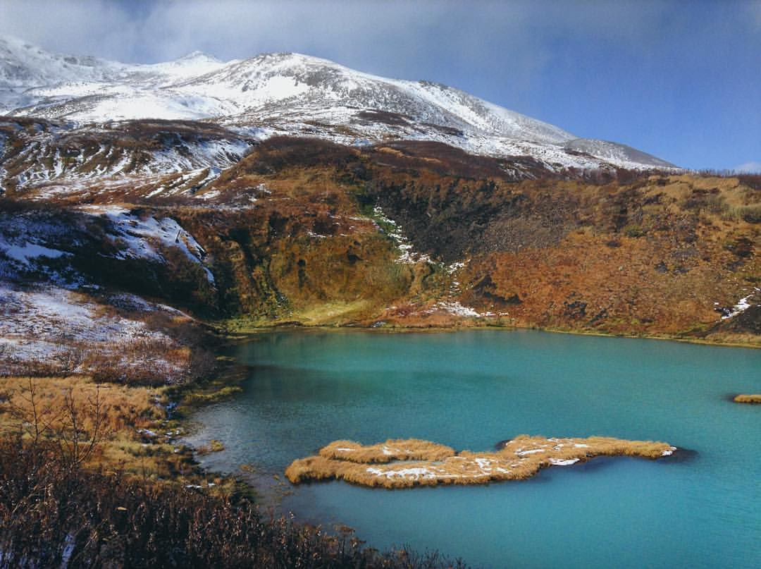 Мутновская геоЭС. Добрался. От нее до источников буквально 15-20минут ходьбы. Постучался к охранникам, попросил погреться и выпить чаю. Пригласили. Как только я собирался уходить, пришел начальник охраны, похоже кому-то сейчас влетит. Пока собирался, было тихо, но в моей голове уже мелькали сценарии, как он скармливает своих подчиненных медведям. Все 20 минут пока я шел, мне было стыдно, но потом мое внимание полностью поглотило озеро, оно приобрело невероятно голубой оттенок. Завораживающе. Купаться в нем, к сожалению нельзя, агрессивная среда. Провел на нем почти час, потом начал думать, куда бы деть рюкзак, чтобы побыстрее пробежать все окрестности