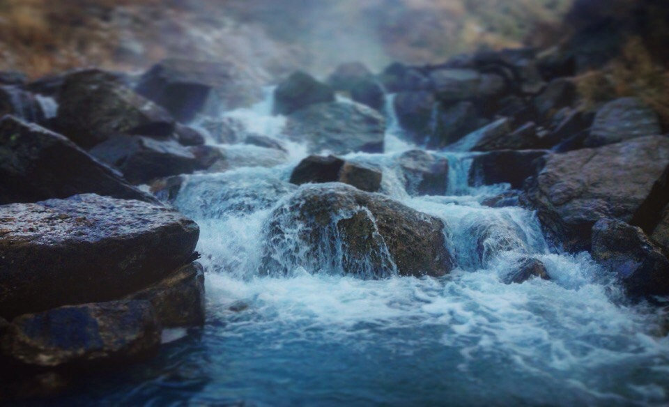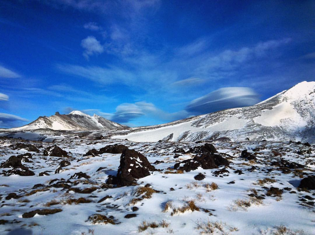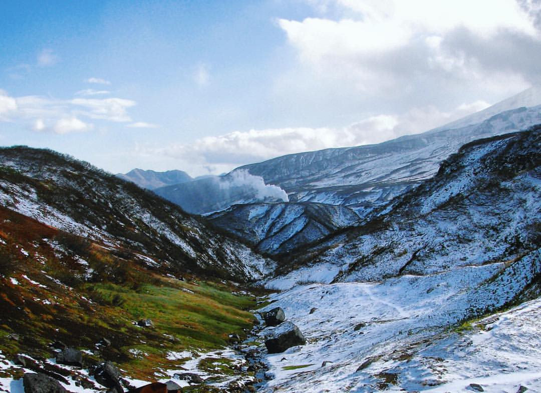 К сожалению, рюкзак так и не смог нигде оставить, что в дальнейшем сыграло плохую роль. Это меня не остановило и я двигался к долине. В это время года, она напоминает борьбу между злом и добром. Снегом и теплом . Благодаря большим подземным температурам , трава тут до сих пор зеленая,что создает невероятное зрелище. В том ручье, что при желании можно разглядеть на фото , сливаются талые воды и сероводородная река (потрясное сочетание!), которая далее превращается в 5 метровый водопад, под которым можно искупаться, совмещая приятное с полезным, но в тот момент у меня была другая задача, дойти до того дальнего столба дыма