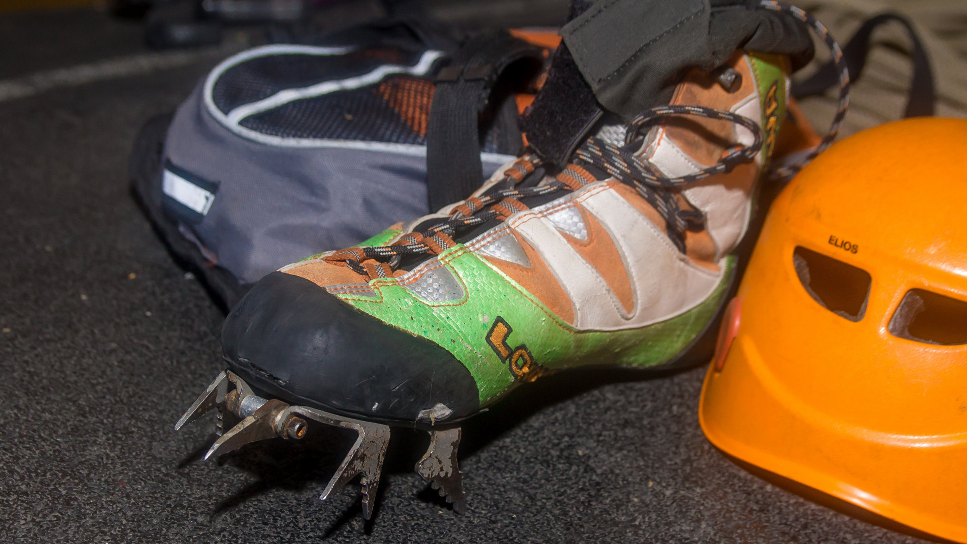 У всех ледолазов на голове каска, на ногах кошки с металлическими зубьями разной геометрии, а в руках ледовые инструменты-молотки, похожие на ледорубы, которыми можно врубаться в лед и цепляться за скальные трещины и зацепы.