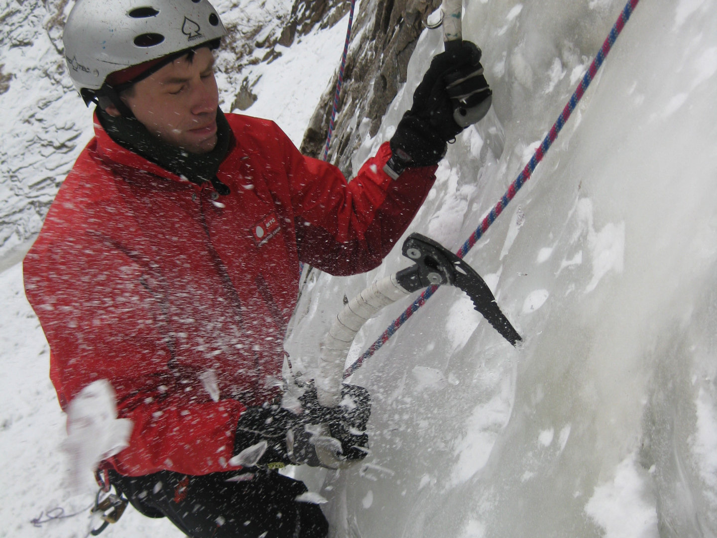 Если вы собрались на природный лед и поднимаетесь первым, надо прихватить ледовые крючья – ледобуры. И вкручивать их время от времени, чтобы простегивать через них свою страховку. Здесь можно долго рассказывать о состоянии льда, его толщине, структуре, о том, как меняется он в зависимости от температуры. Скажу одно: бывает, начинаешь лезть – молотки отскакивают ото льда и осколки во все стороны, такой лед перемороженный, твердый и хрупкий, а потом поднимаешься в пятно солнечного света – и по стене течет вода, а инструмент вязнет, а еще выше ты наслаждаешься воодушевляющим журчанием – это где-то под твоей тонкой ажурной ненадежной опорой булькают ручьи, выплескивающиеся фонтанчиком, когда выкручиваешь бур за напарником. Ну вы поняли, все очень разнообразно, и без чувства льда, интуиции или опытного наставника лучше не экспериментировать.