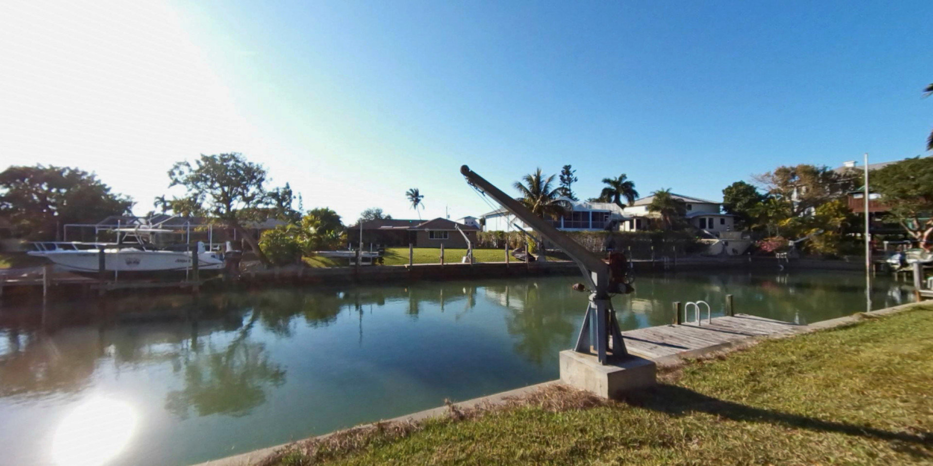 Один из участков между домами был не застроен, была табличка о продаже, я подошел по этому участку к каналу. Не смотря на пустую землю, участок по умолчанию снабжен причалом и краном для лодки.