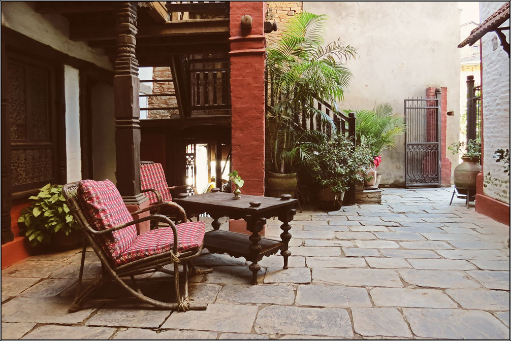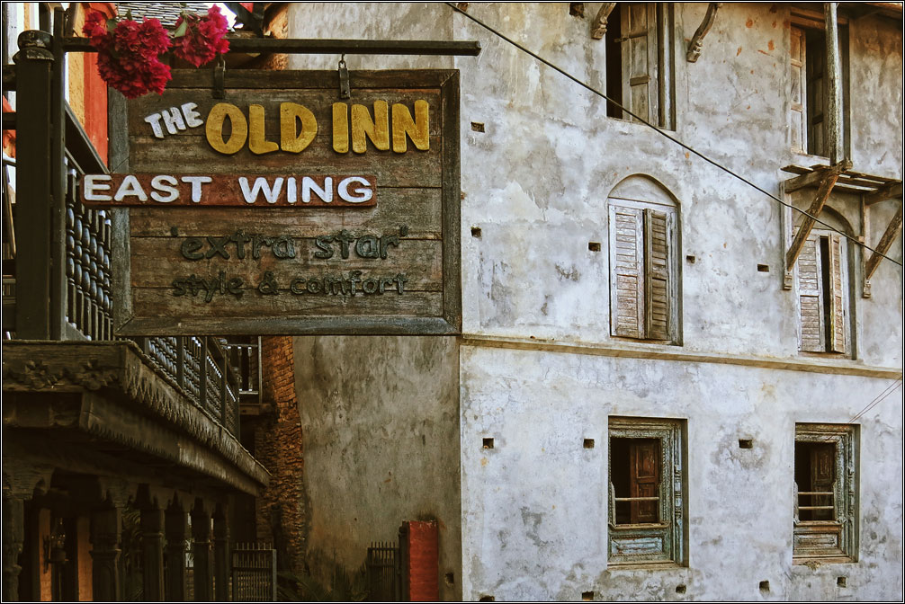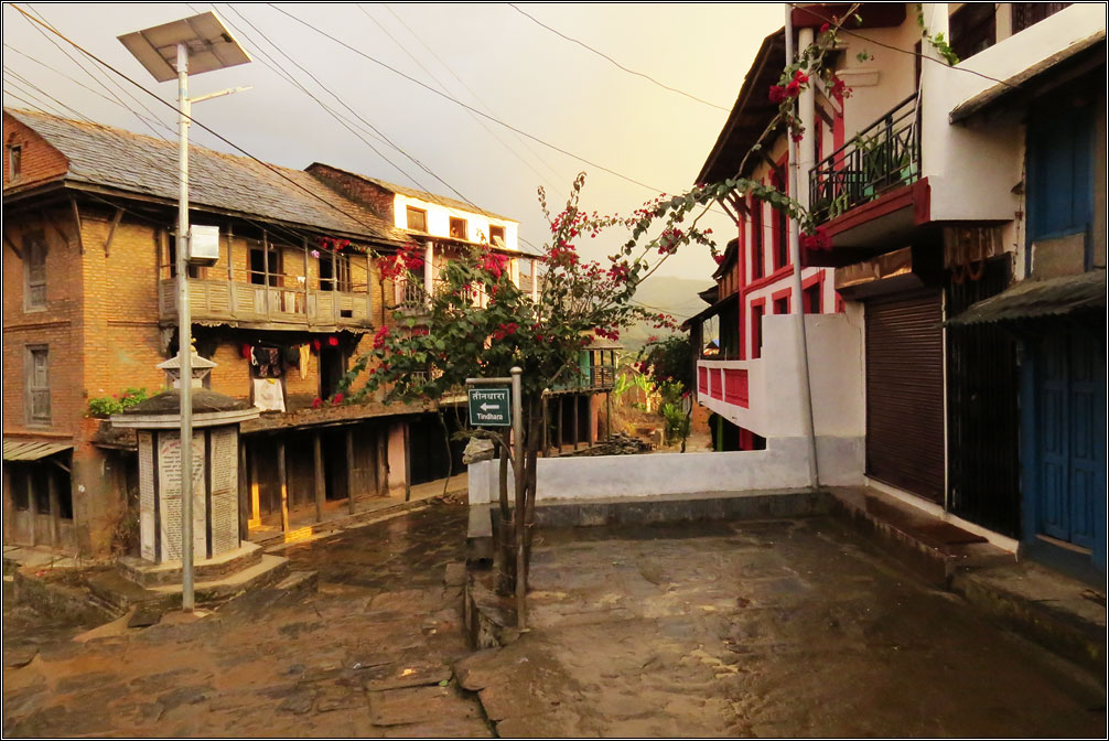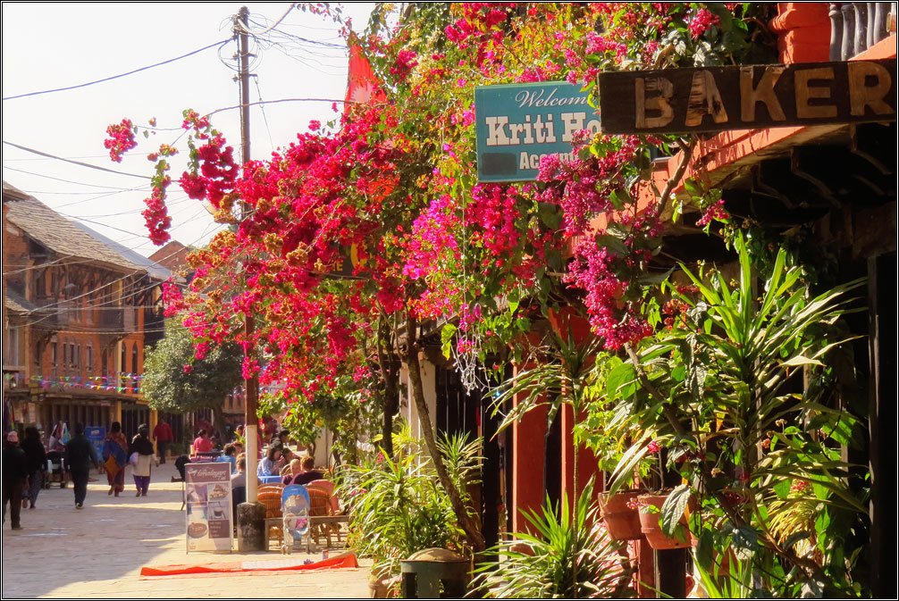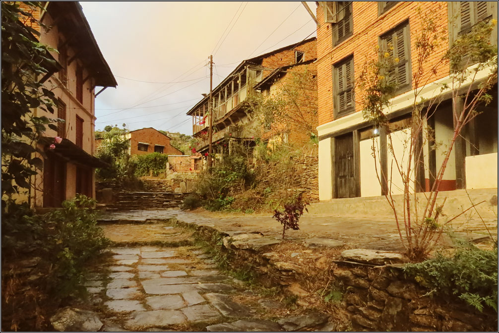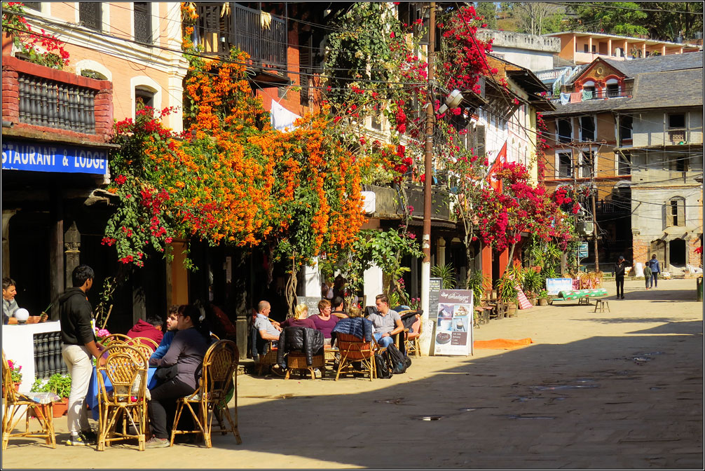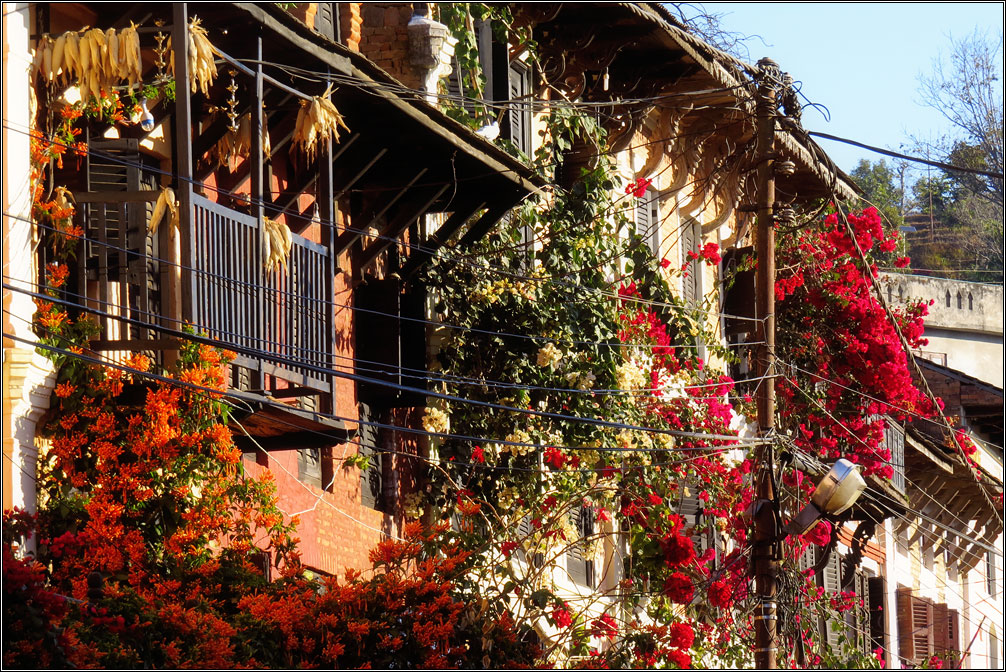 Деревянные ставни на окнах, увитые цветами балконы и галереи, столики уличных кафе с клетчатыми скатертями, брусчатая мостовая, каменные лесенки, кованые фонари. Все это — характеристики, присущие туристическим городам старой Европы... и Бандипуру, затерянному в горах Непала. Второе, чем меня поразил этот город — совершенно непохожий на увиденное ранее в Непале архитектурный стиль. Конечно, местный колорит делает его не столько европейским, сколько колониальным, но даже само наличие стиля уже удивительно.