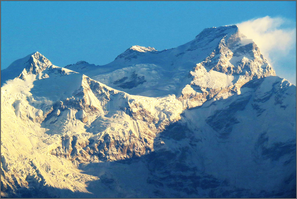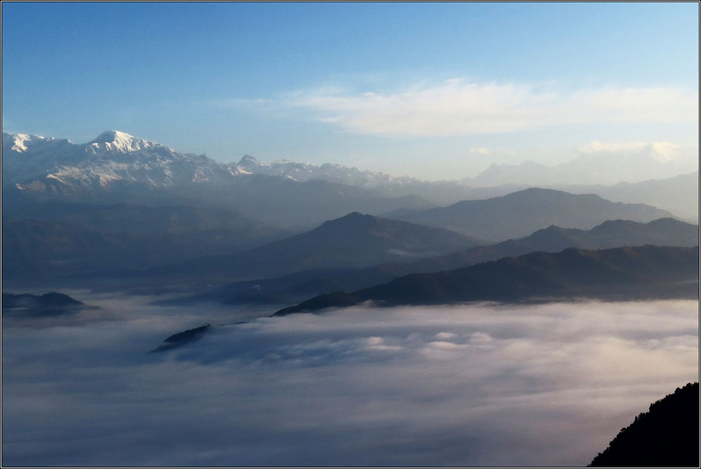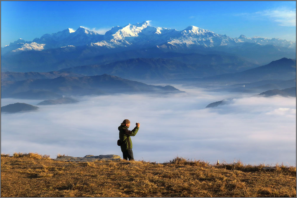 Зрелище было совершенно потрясающим. По большому счету, вот именно ради этого момента я и приехал в Непал. Стоишь под утренним солнцем, разинув рот, смотришь на крышу мира, над тобой темно-синее небо, под тобой целое море облаков, ветер треплет волосы, холод забирается под куртку, но ты совершенно по-детски счастлив.
