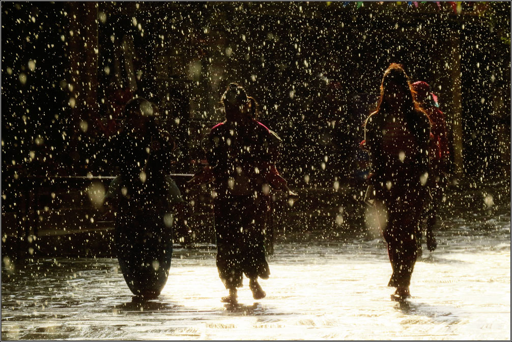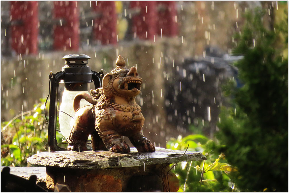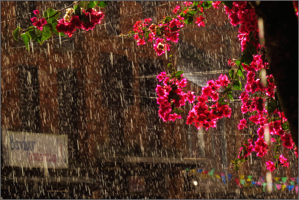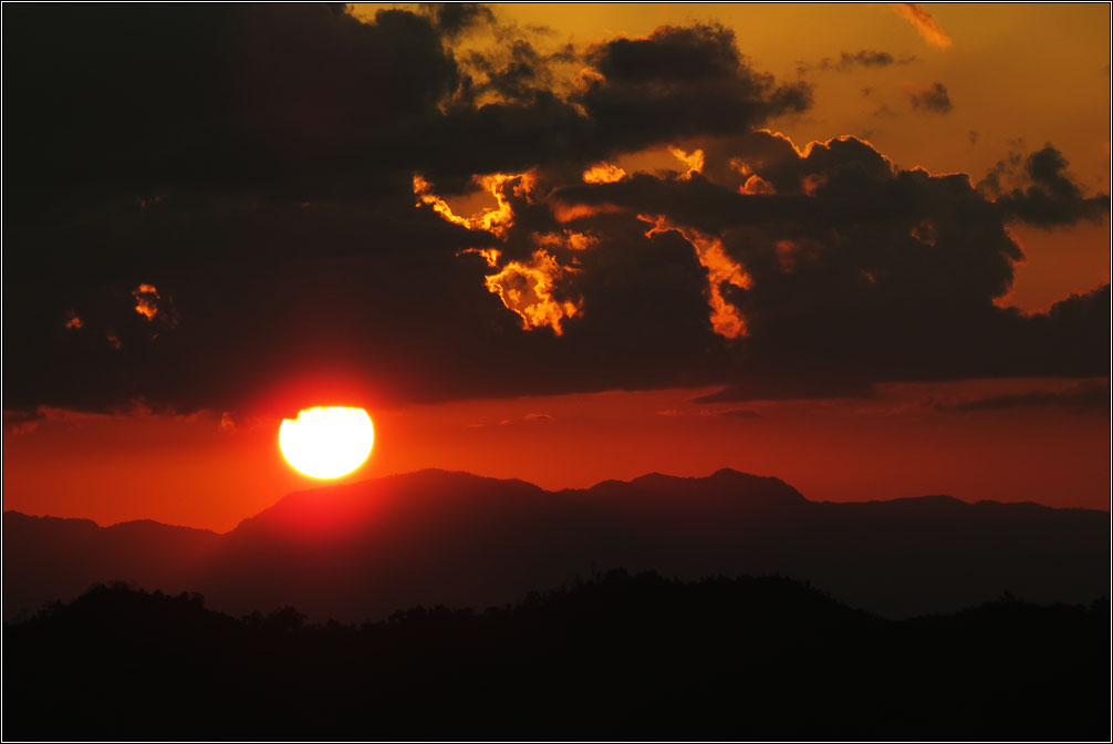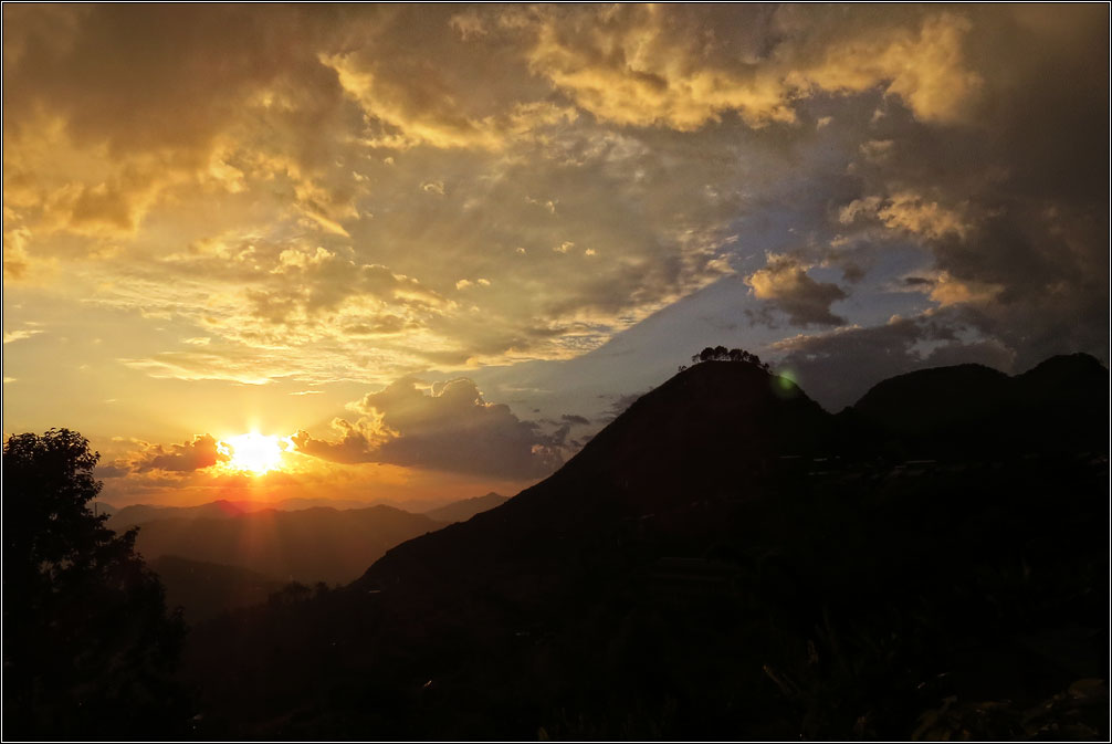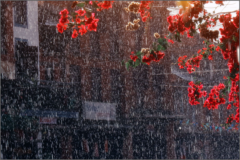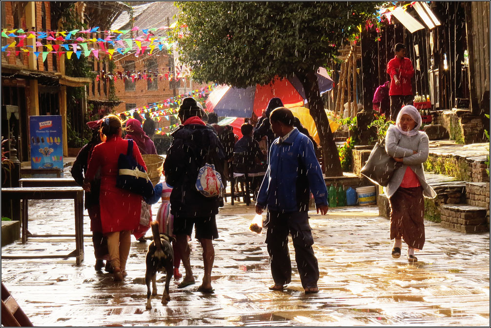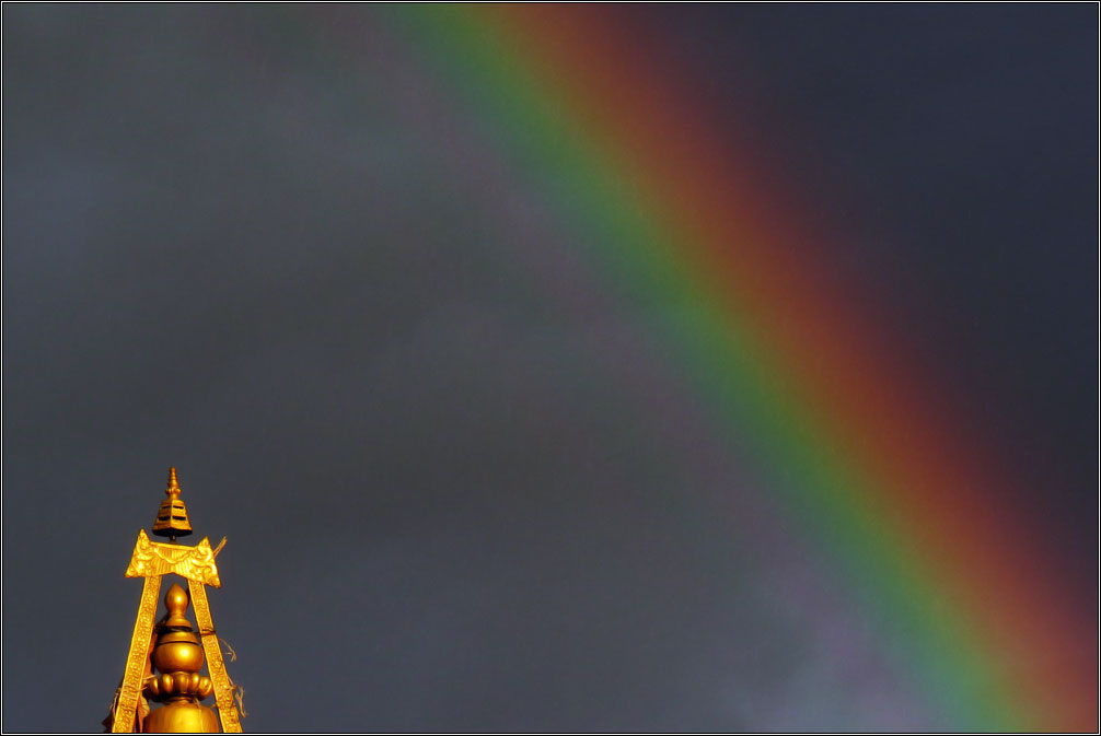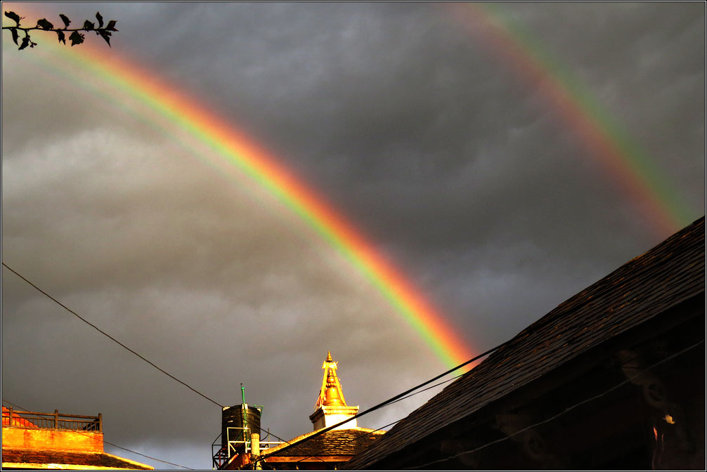 Сейчас в Непале сухой сезон, так что дождей я не видел в течение всего месяца. И, когда внезапно пошел ливень, это было непривычно и красиво, поскольку туча заняла только половину неба, во второй же половине сияло яркое солнце. Дождь прошел за какие-то полчаса, и в облаках неожиданно ярко засияла двойная радуга. Жаль только, что снять ее толком так и не получилось, в городе весь вид перекрывают натянутые повсюду провода, а пока я добежал до открытого пространства, обе радуги уже основательно побледнели. Зато закат получился ожидаемо красивым.
