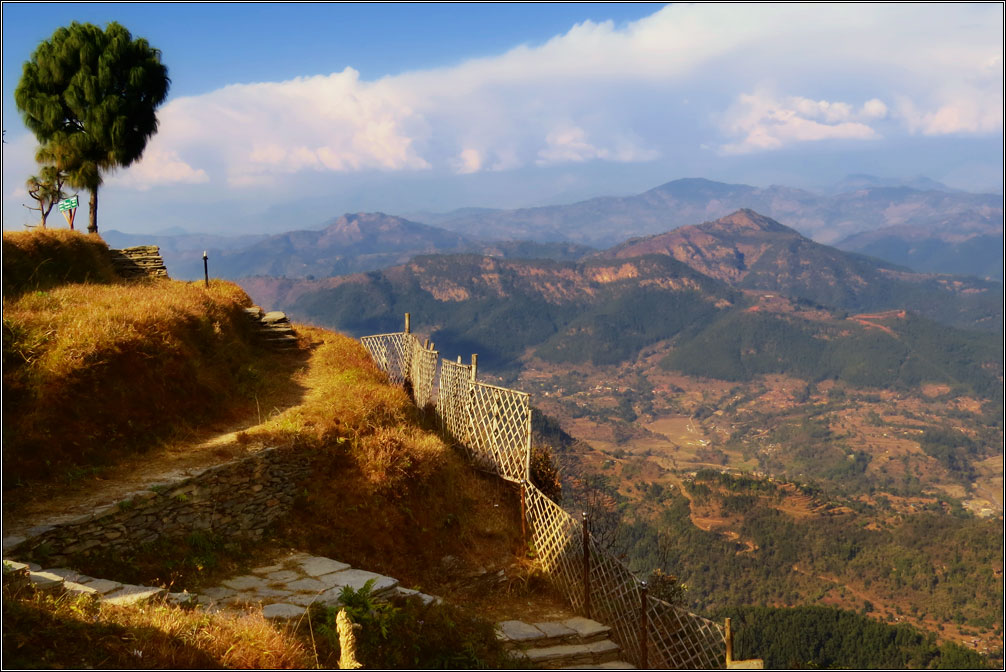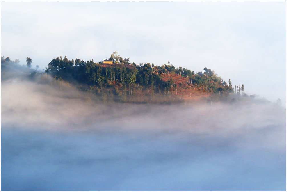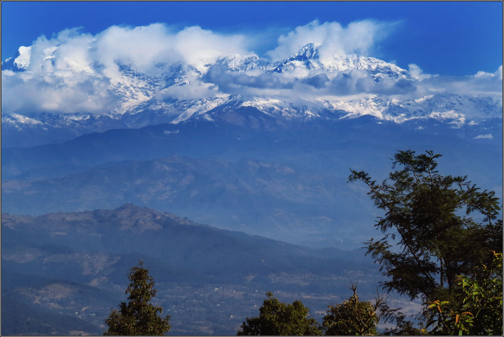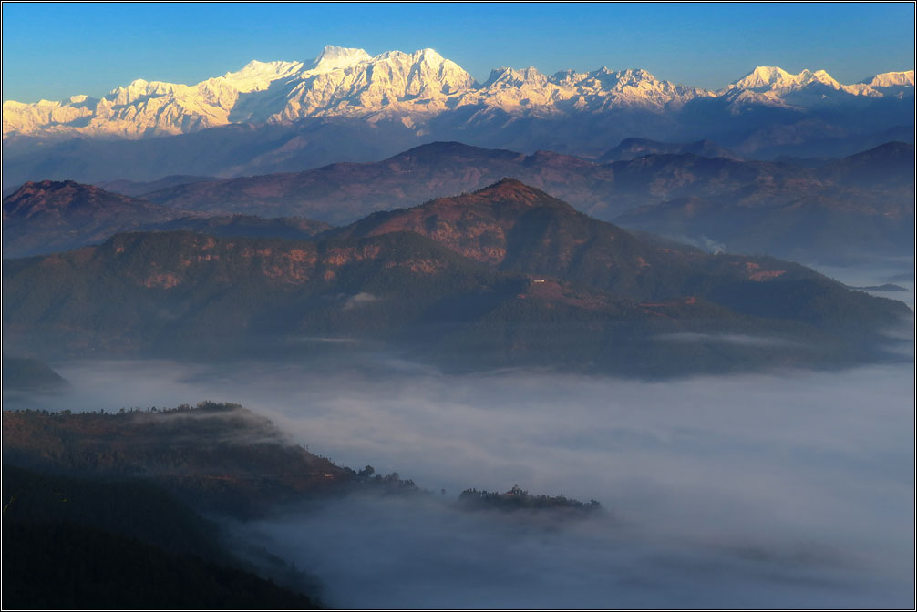 Накануне прошел дождь, в долине внизу сгустился туман, из него местами выглядывали зеленые холмы, а над всем этим гордо сверкали Гималаи.