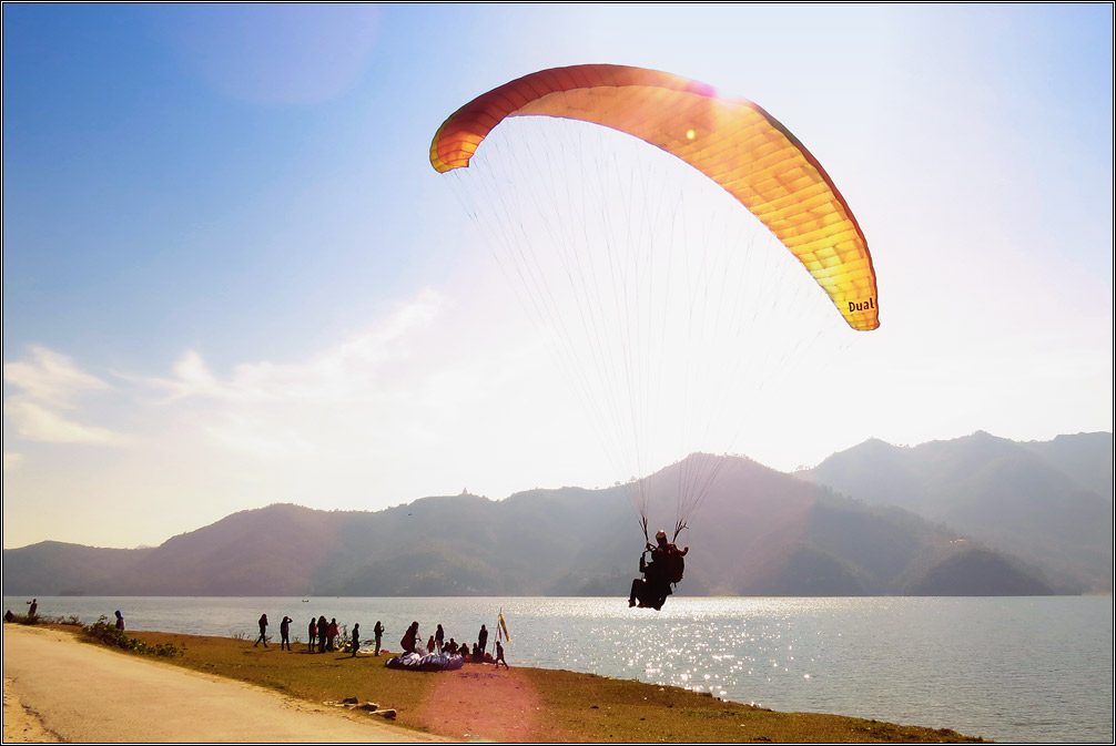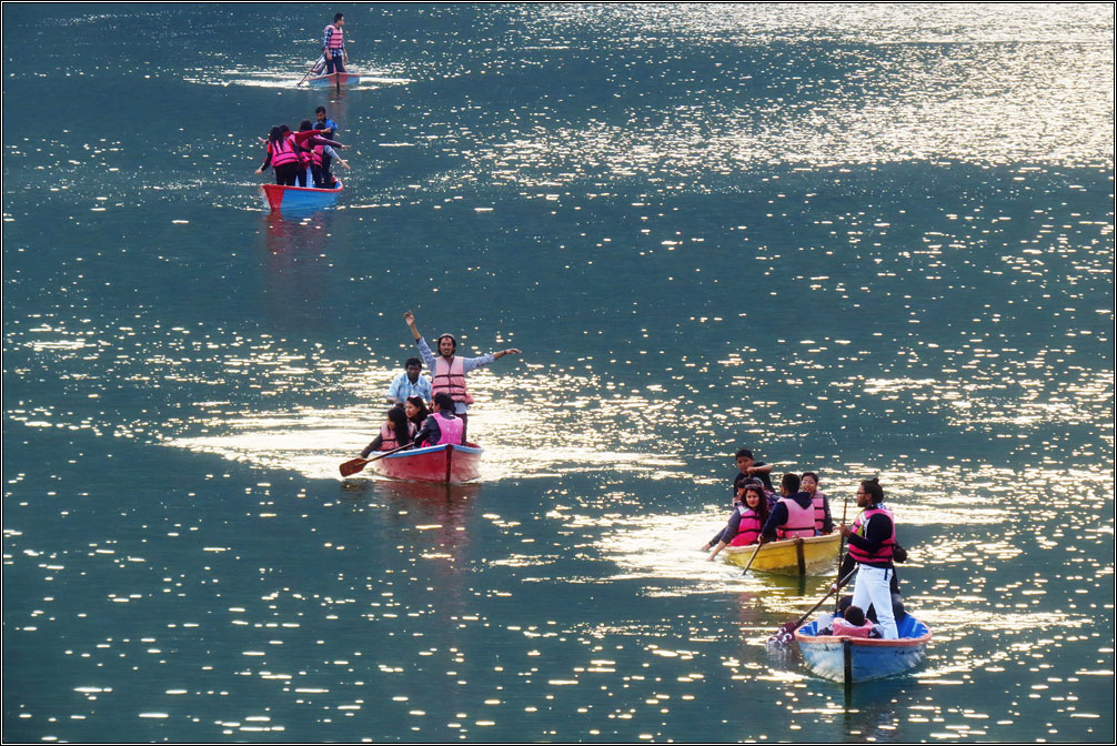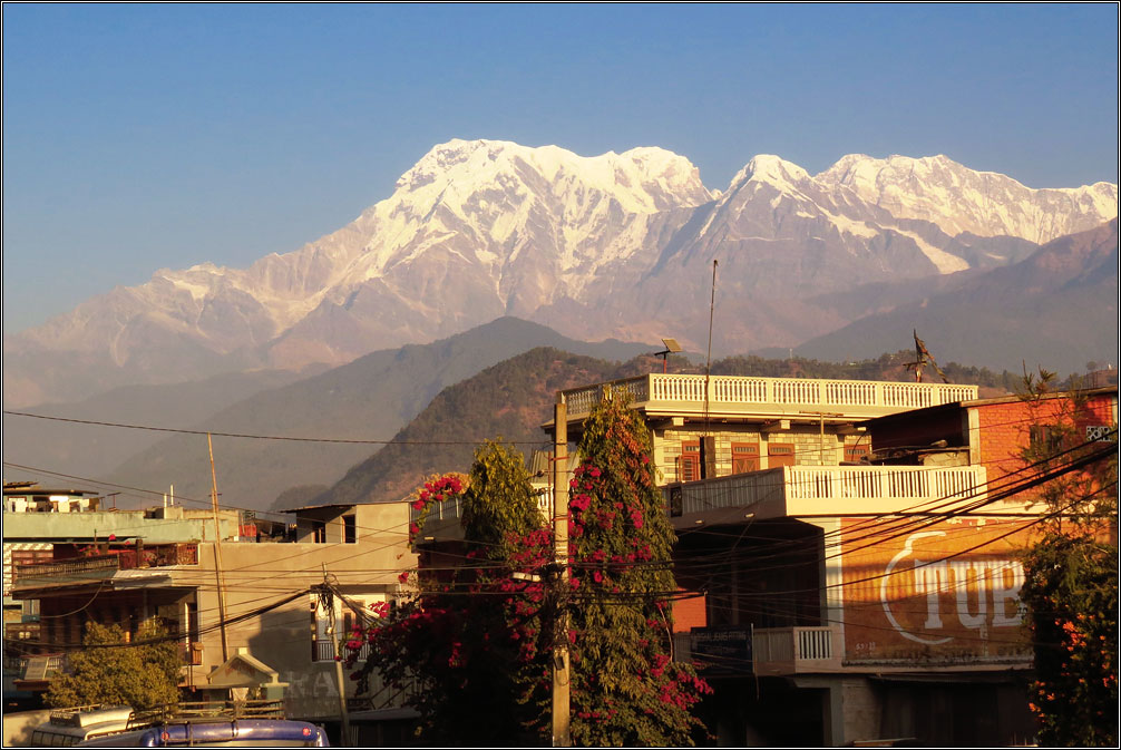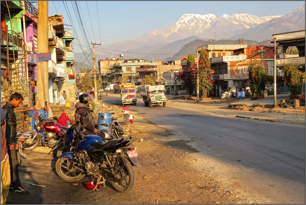 Когда перед поездкой читал про Покхару, неоднократно сталкивался с мнением, что это место для полного релакса. Пока, если честно, ощущения у меня именно такие. Здесь тихо, толп туристов нет даже на самой оживленной улице с магазинами, туристическими конторами и отелями. Многочисленные рестораны стоят полупустыми даже вечером. По озеру катаются на лодках, в небе парят парапланеристы, а на горизонте видны заснеженные пики восьмитысячников.